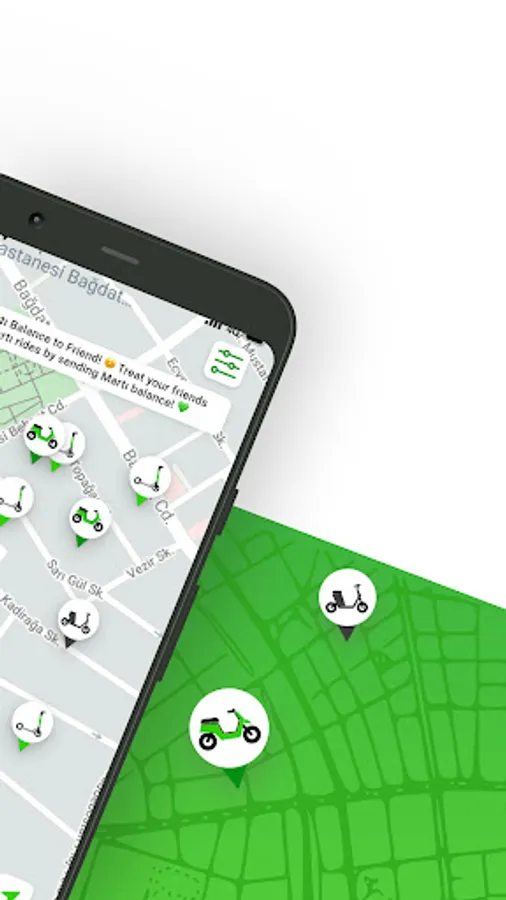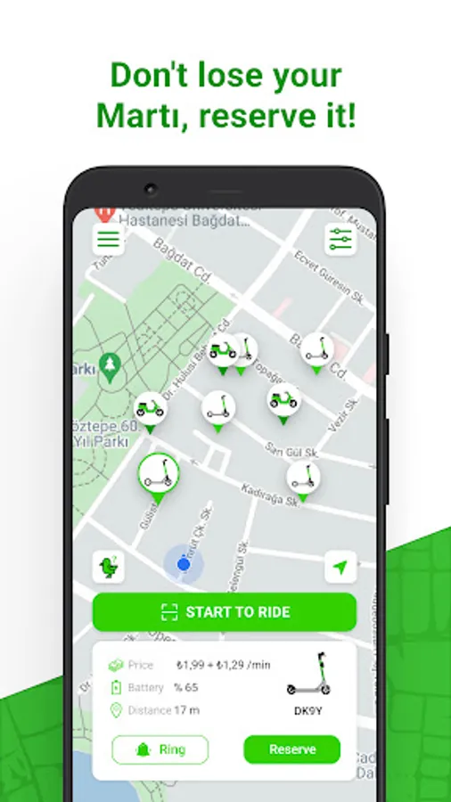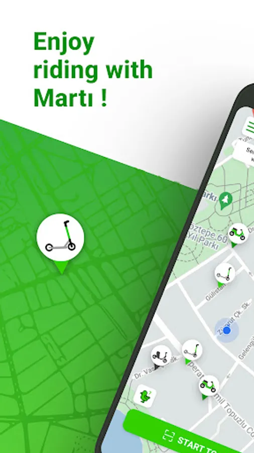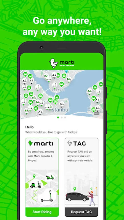 Martı is a transportation application that allows you to reach wherever you want, whenever you want. By requesting a vehicle under the TAG option in Martı, you can go wherever you want to go safely in the comfort of a private vehicle, and you can go to your destination you want to reach with an electric vehicle (scooter, mobilet, moped) in a fun, fast and environmentally friendly way.