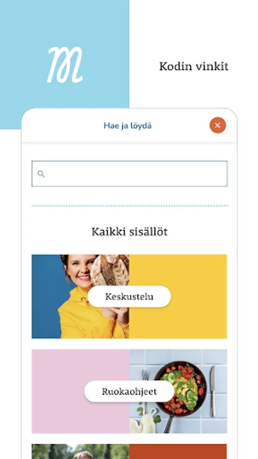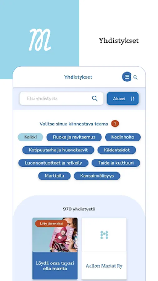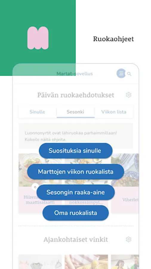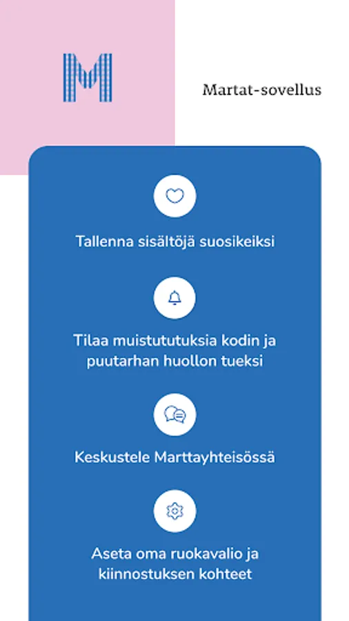 The Martat application is an application published and maintained by Marttaliitto ry. The application contains a collection of delicious recipes as well as Martta's most beloved housekeeping tips and the issue of sustainable everyday life from mushroom trips to the cultivation of useful plants.