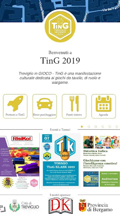 Click on the TinG logo at the top, or drag it downwards, to discover the interactive map of the historic center of Treviglio: the points of interest of the various attractions in the city during the weekend of September 1st will appear.