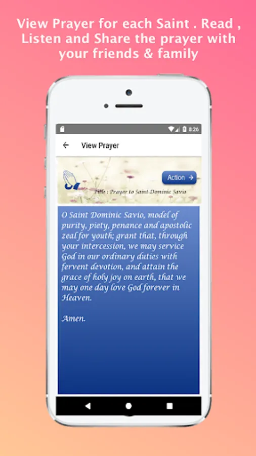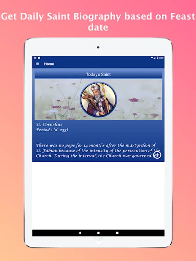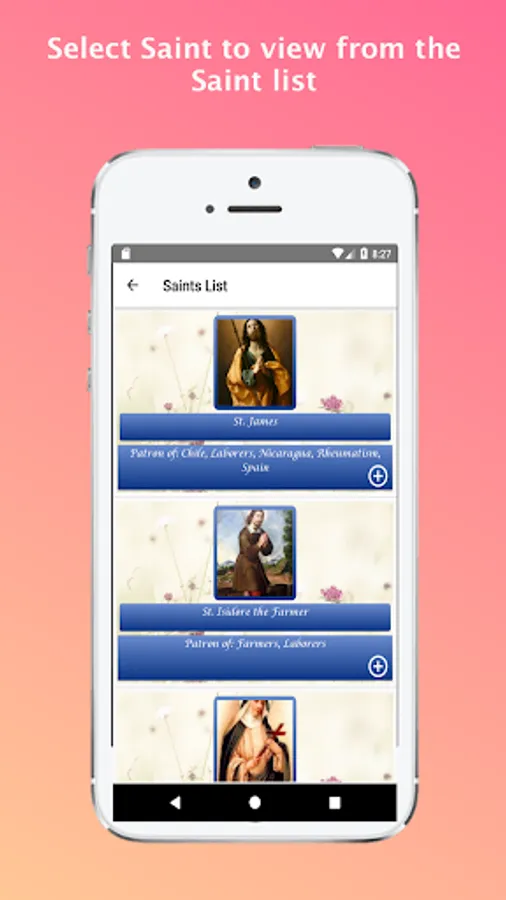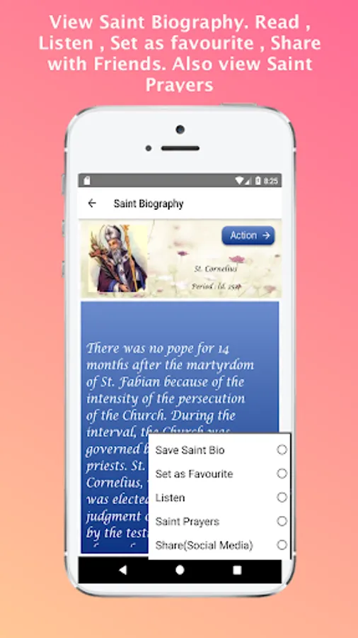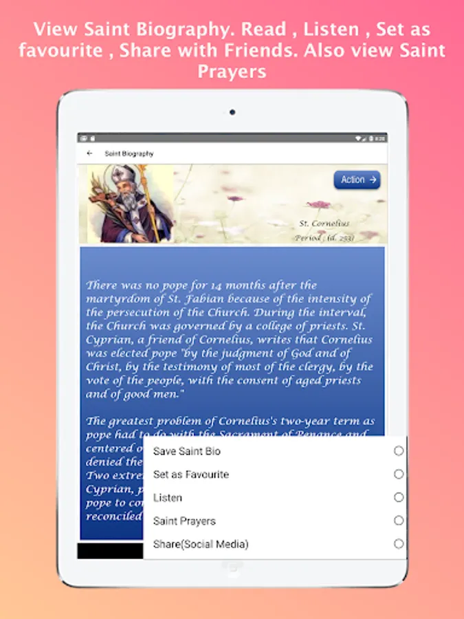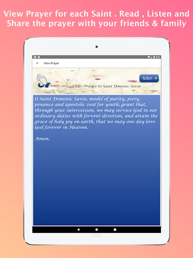 The app gives you a short biography , prayers and Patron Information which will make you understand the sacrifices done by them and inspire you to lead a spritual life .