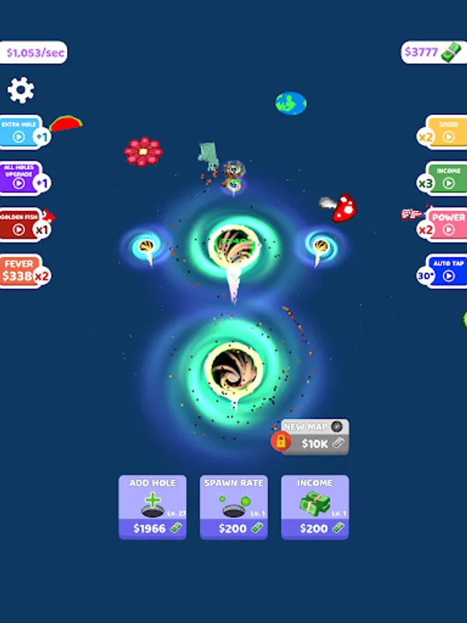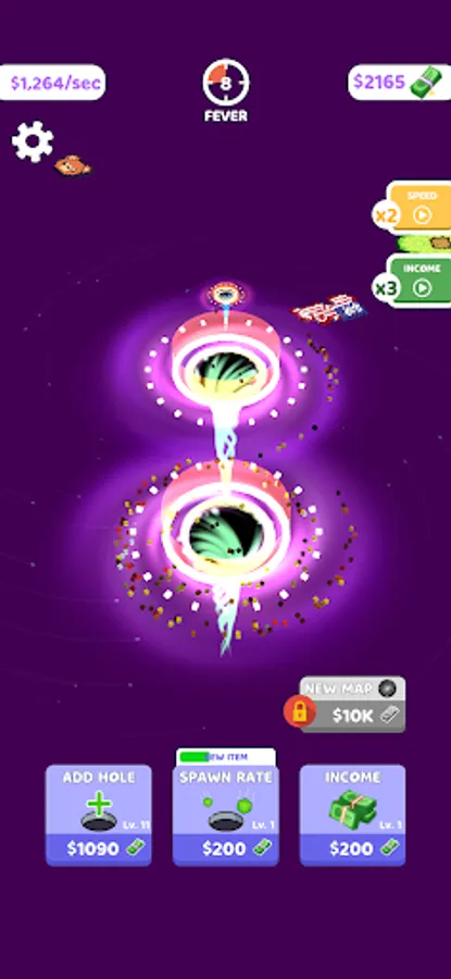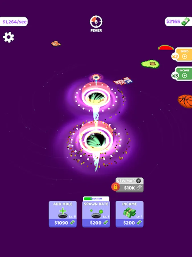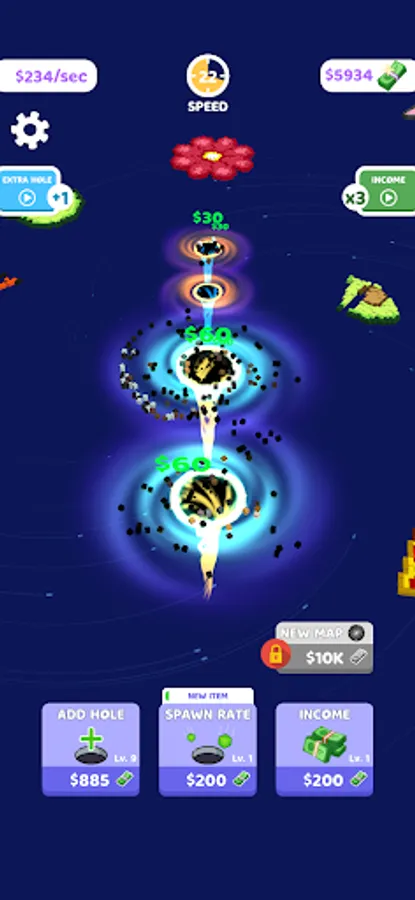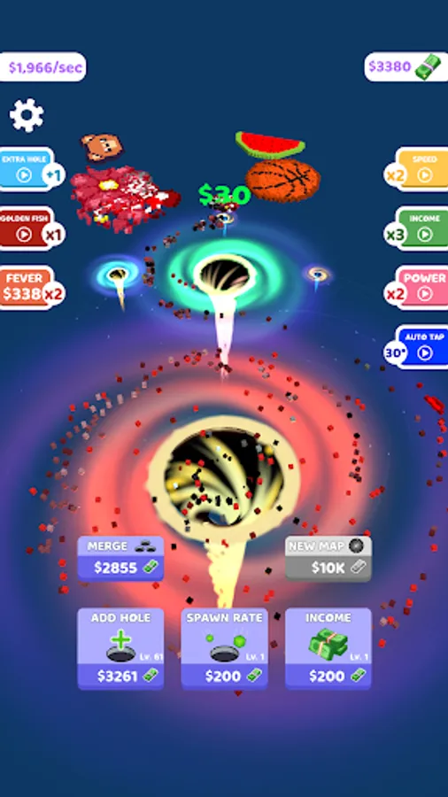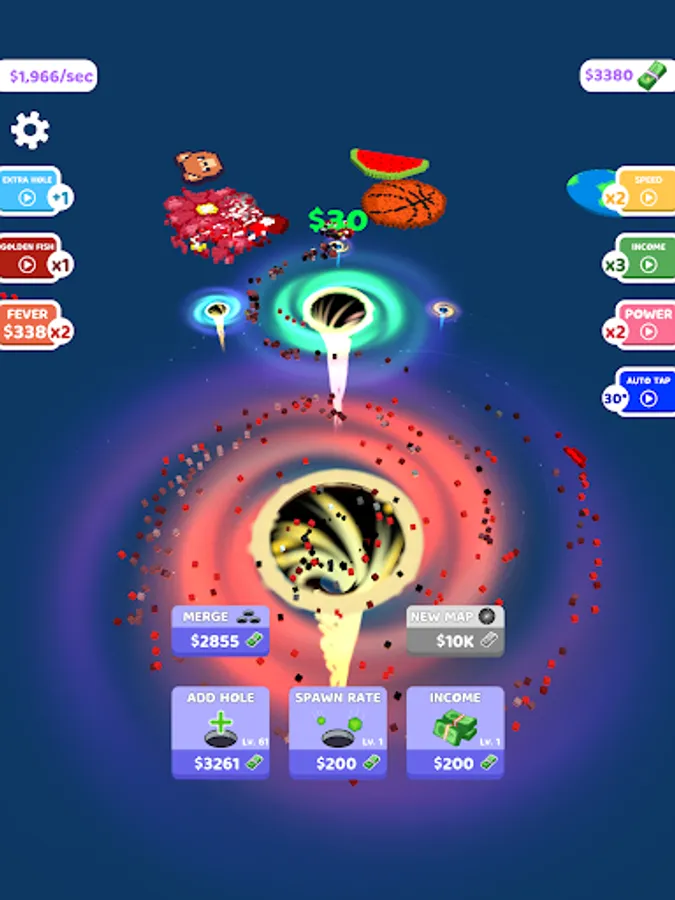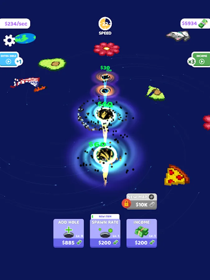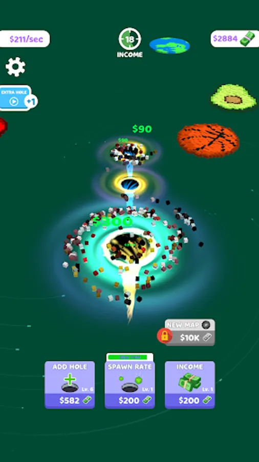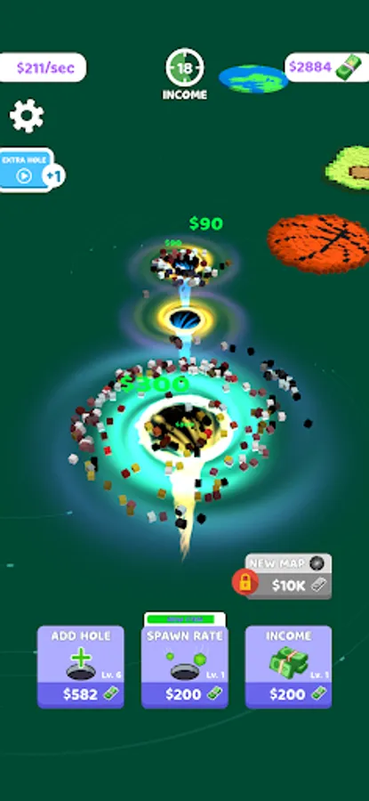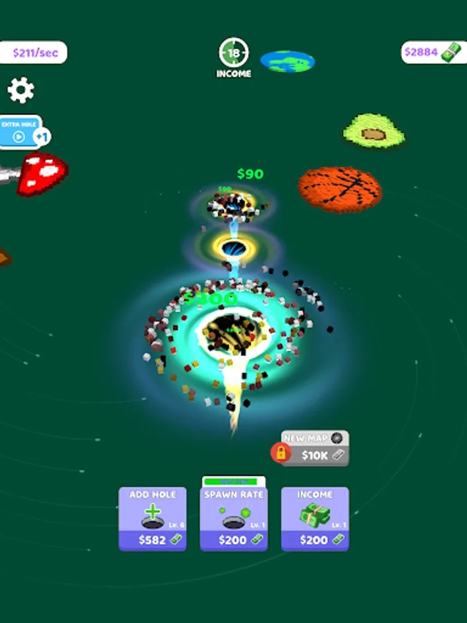 Smash all new objects and swallow every piece. Keep making money from every piece you send into the black hole. Expand your black hole and destroy more pieces!