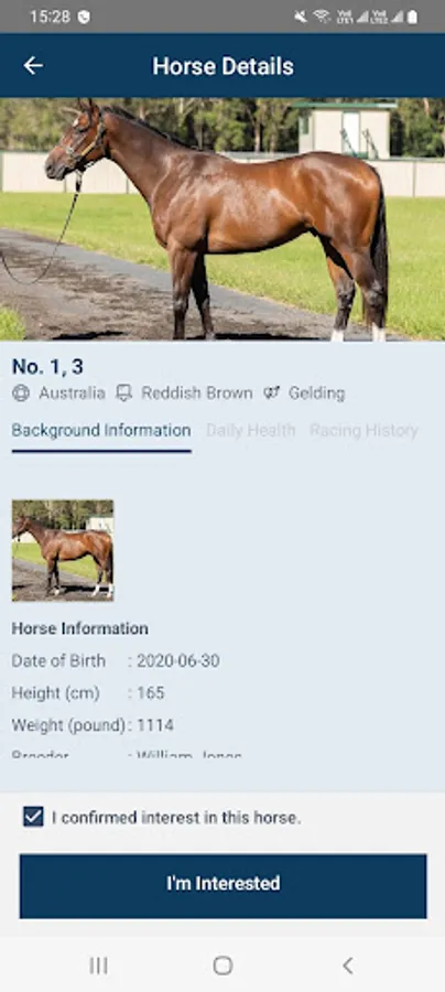 The mobile app provides detailed information about the horse that the user wants to buy, as well as information about the horses to help the user to make a choice. The mobile app has the horse's information, which includes paternal and maternal information, the horse's daily health information, photos and videos (about 10-20 seconds), and the horse's real-time location. Users can view horse information directly from the mobile application database at any time.