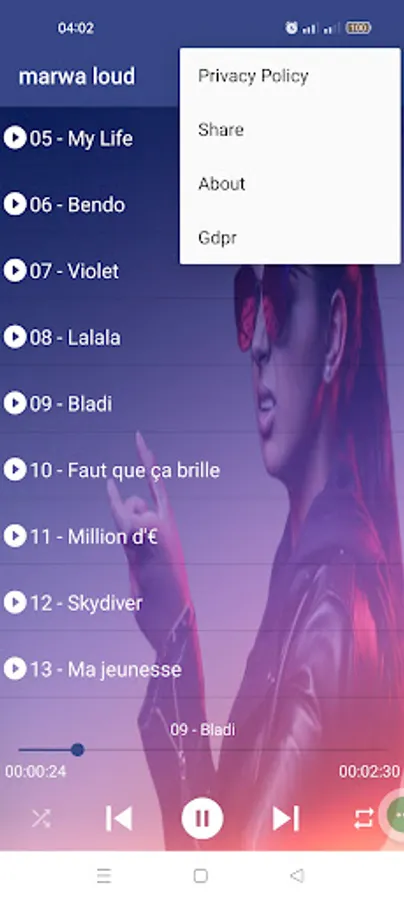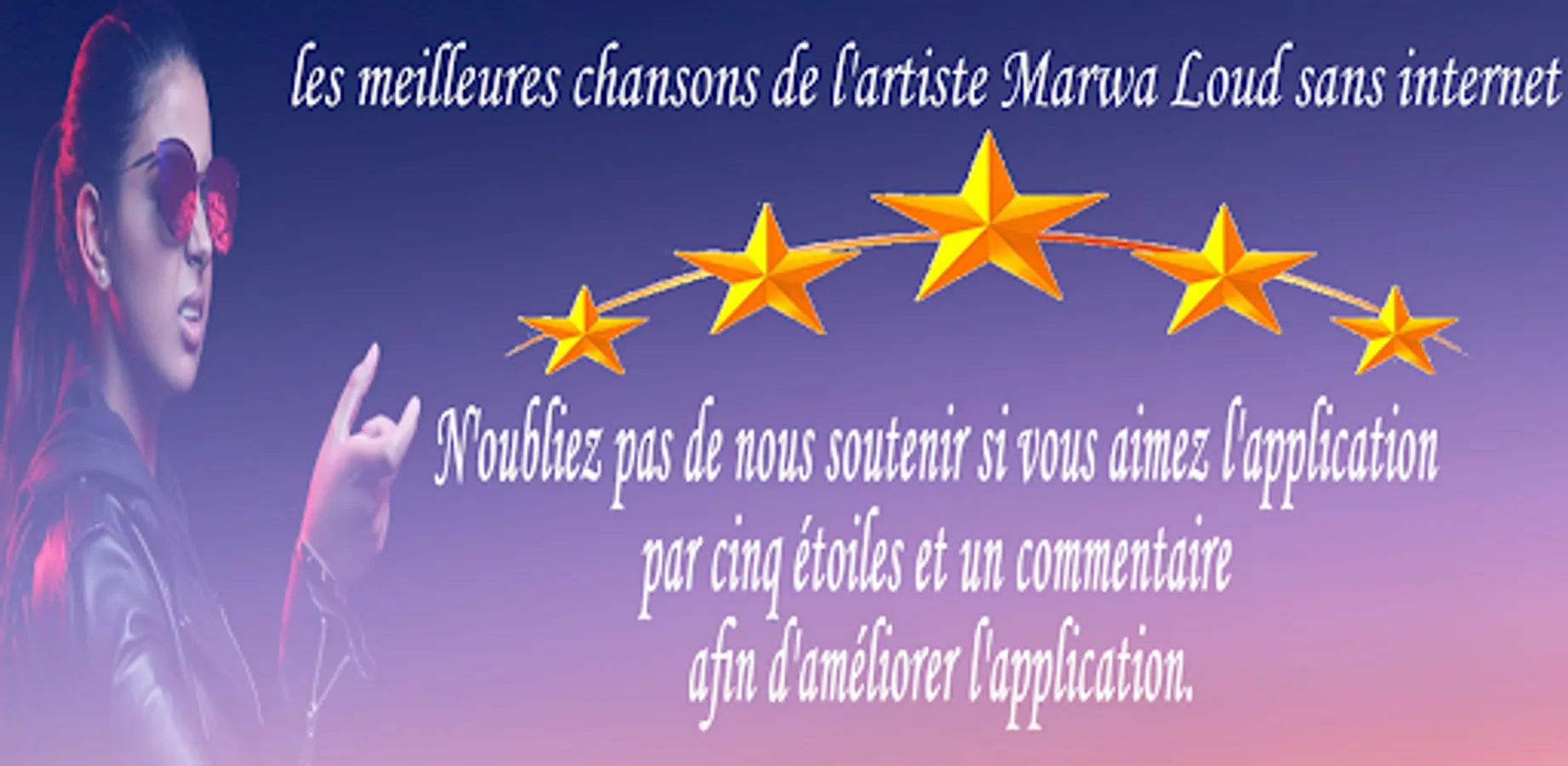 In this application you will find the best songs and updates of Marwa Loud. Download the free app on your smartphones for an unlimited time and enjoy the best songs with high quality sound and without internet.