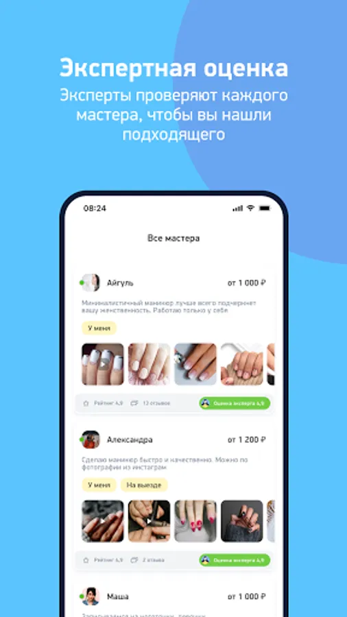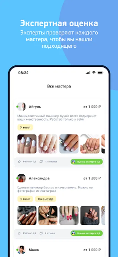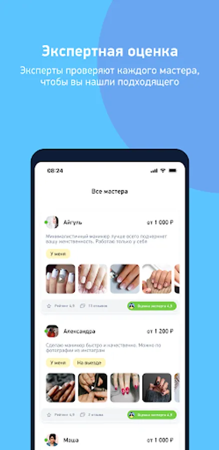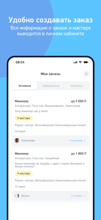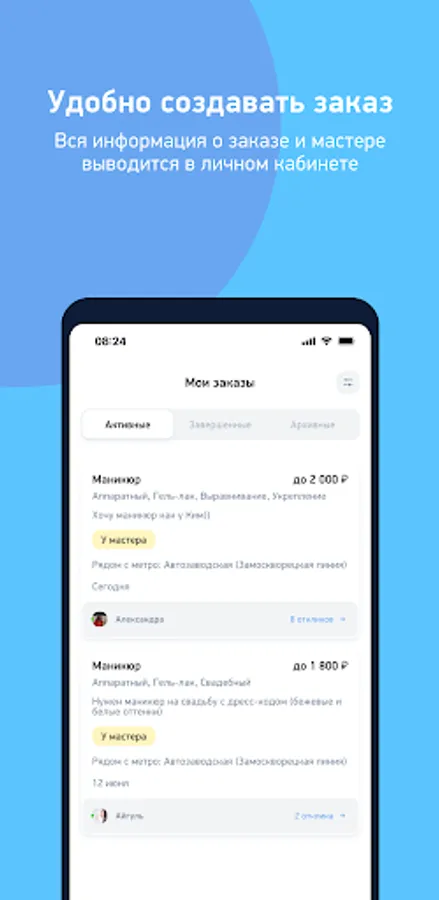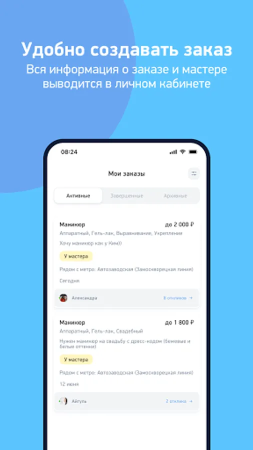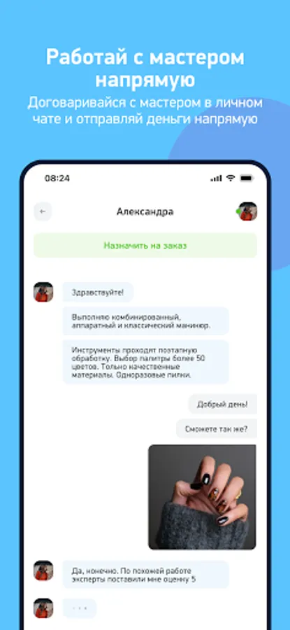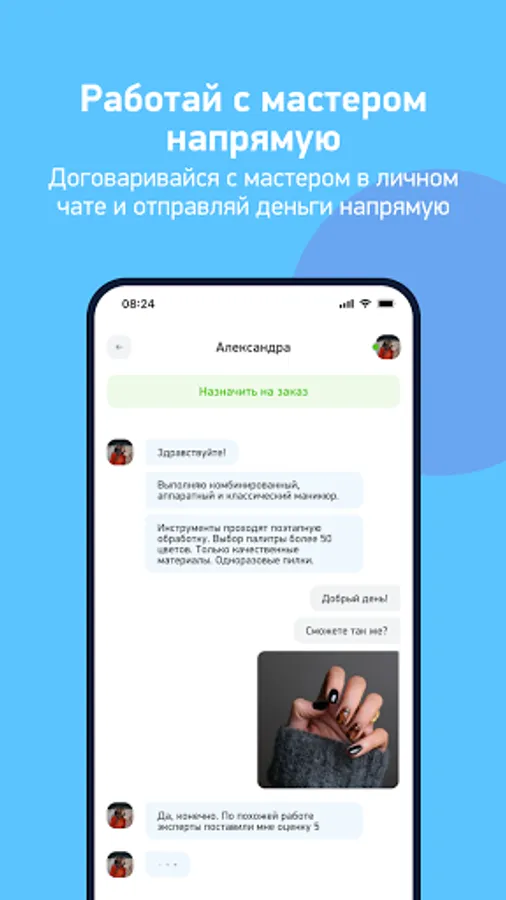 To find a master, you just need to create an order. Choose your manicure or pedicure type, date, meeting point, and budget. The masters will respond to your order. Look at the profile of the master with information about the experience and examples of work. The application has a chat where you can chat with the master and clarify the details.