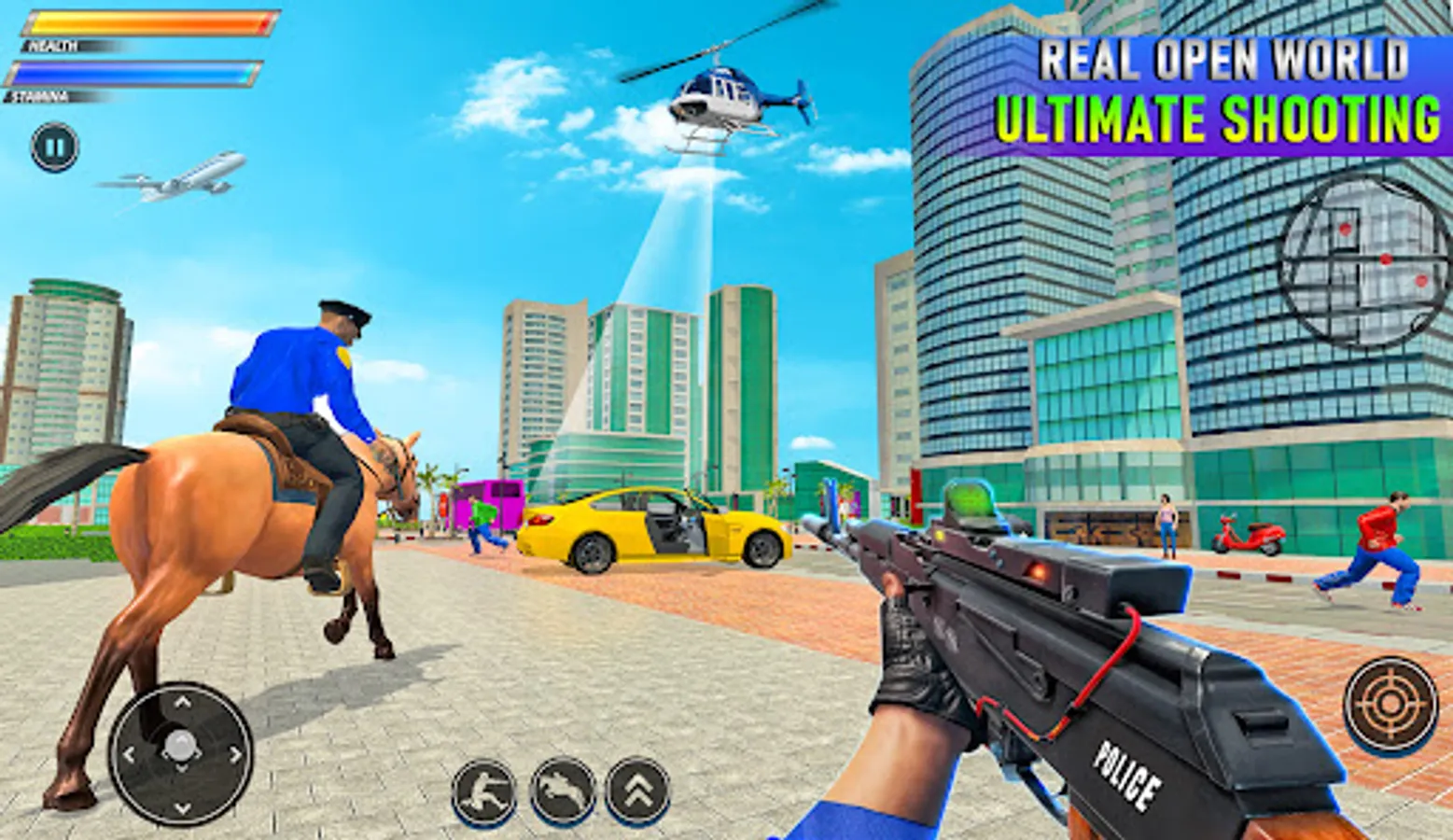 Police crime shooting gangster chase city rescue mission is waiting. Time to act as US police horse crime shooting games duty chase simulator to save city with city rescue missions from criminals in the best of our police simulator and under arrest the gangsters in cop games. Chase criminals who are convicted in jail break and you have to catch prisoners and control the security of the crime city police car chase game. Complete all levels of police horse game shooting attack criminals in the gangster chase city as and be the quick runner in police shooting games. Some criminals might be carrying illegal weapons. They might run away before you reach so chase and arrest them in police games 2021. Don’t let police officer game or police horse city turn into a crime place. So time to forget other police horse games with dog and play latest anti-terrorist 3d game with superhero police horse chase.