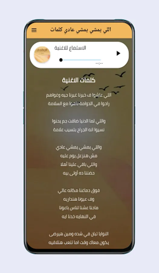 Songs are considered entertainment and self-propelled devices because of the content they offer close to us at the time of our joy and sadness, and there are many of us who listen to songs and often do not understand their words, and the application that walks normal words has come to offer you the most beautiful, wonderful, most enjoyable, and most pleasant songs that you can listen to. Through audio clips with its detailed words with clarity, accuracy and high quality, you can move between them and stop them whenever you want, as we provide them to you without the need to connect to the Internet (offline), as the lyrics of the song help you to understand and love it more, and the application that walks normal words is distinguished, that you can Share the song with the one you love, and the application is also characterized by displaying songs in a modern and beautiful design, download the application who walks normal words now and enjoy with us the most beautiful songs
