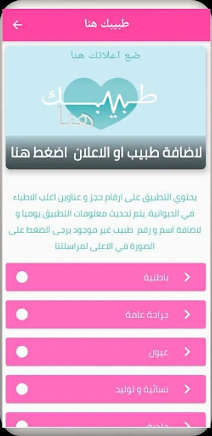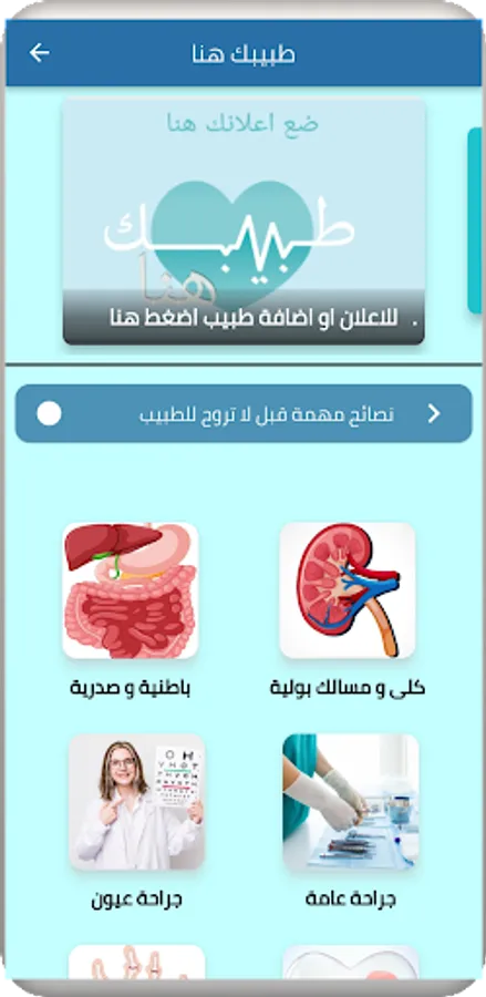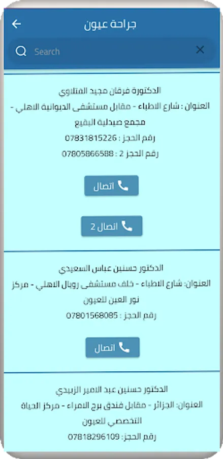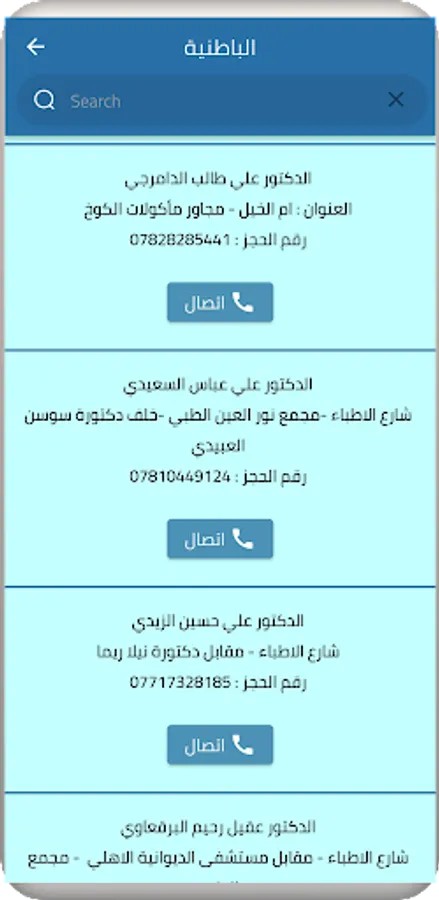 Your doctor application here contains the addresses and numbers of booking doctors in Diwaniyah, and the rest of the governorates will be added until work is completed on them, as we will try in this application to add all doctors as much as possible to facilitate the process of booking an appointment or knowing the doctor’s address