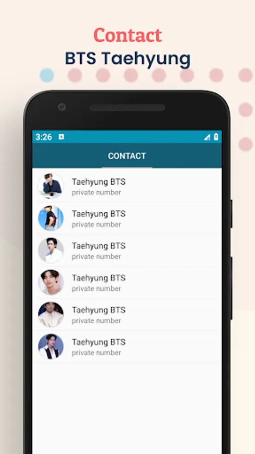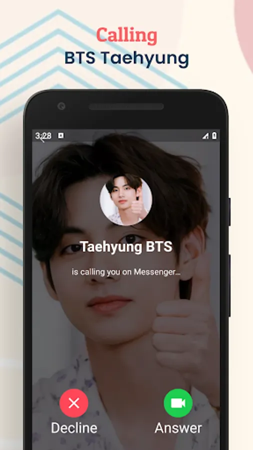 With this application you can prank your friends as if you were on the phone of your favorite artist, BTS Taehyung. Your friends must think that you have BTS Taehyung's phone number. You can also show off with your friends by taking a screenshot during a video call and then sharing it on your social media.