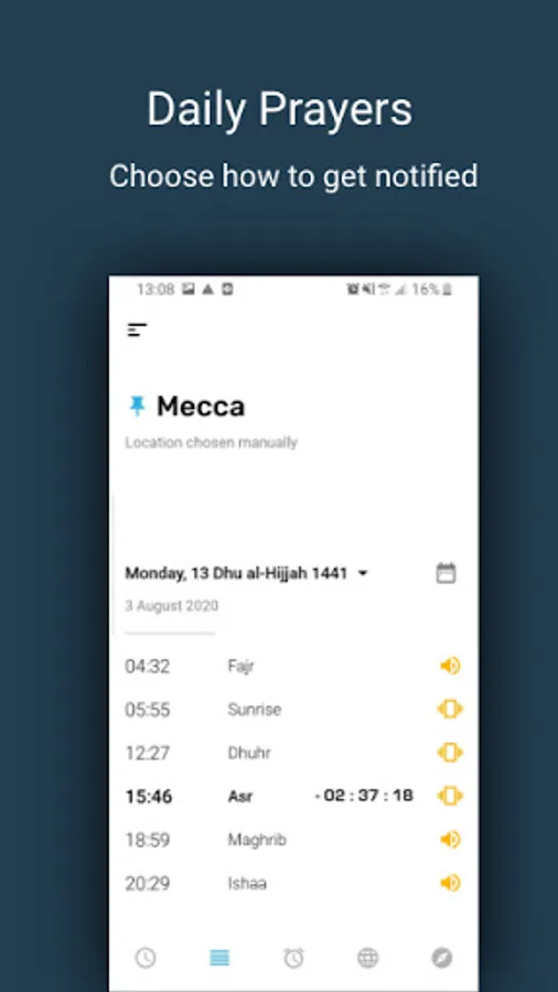 عن طريق تحديد موقعك تلقائيا، بإمكان هذا التطبيق أن يعلمك بأوقات الصلاة وكذلك تحديد اتجاه القبلة.