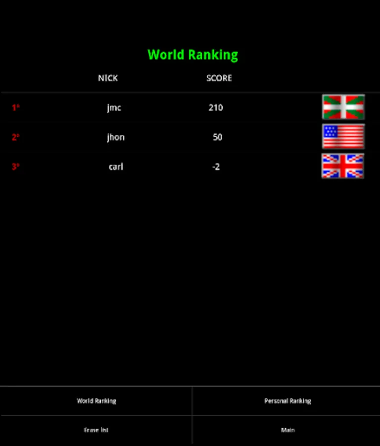 The score is displayed on a World Ranking, in which you put your nickname and choose the name of your country.
