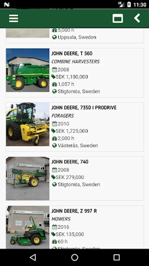 The Green Deere Used App contains all used machines from Green Deere Holdings John Deere dealers: Svenssons Motor AB, Agro maskiner Gotland AB and Bil och traktorservice AB