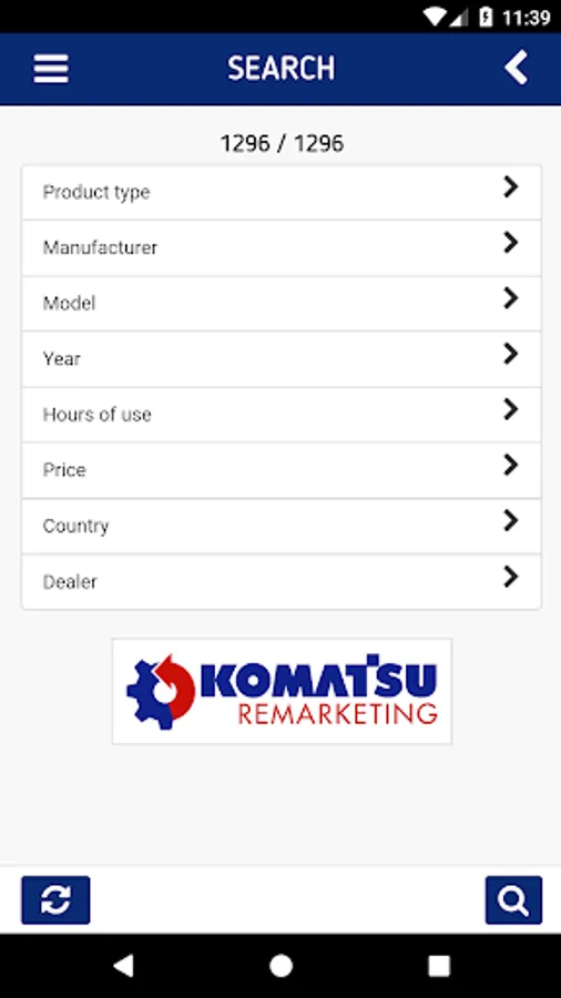 The App allows you to easily search for used equipment on the Komatsu Network by selecting filters such as Product Type, Manufacturer, Model, Year and Hours.