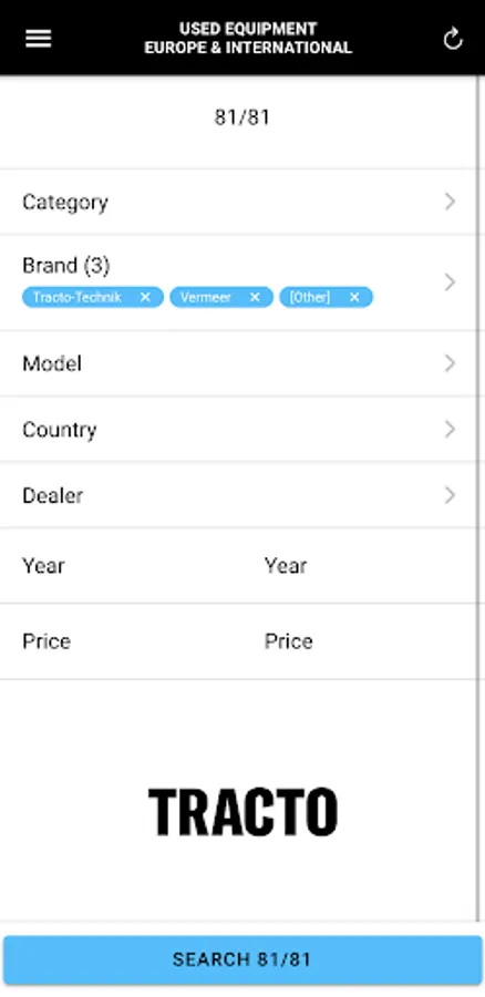 The App allows you to easily search for used equipment by filters such as Product Type, Manufacturer, Model, Year and Hours.
