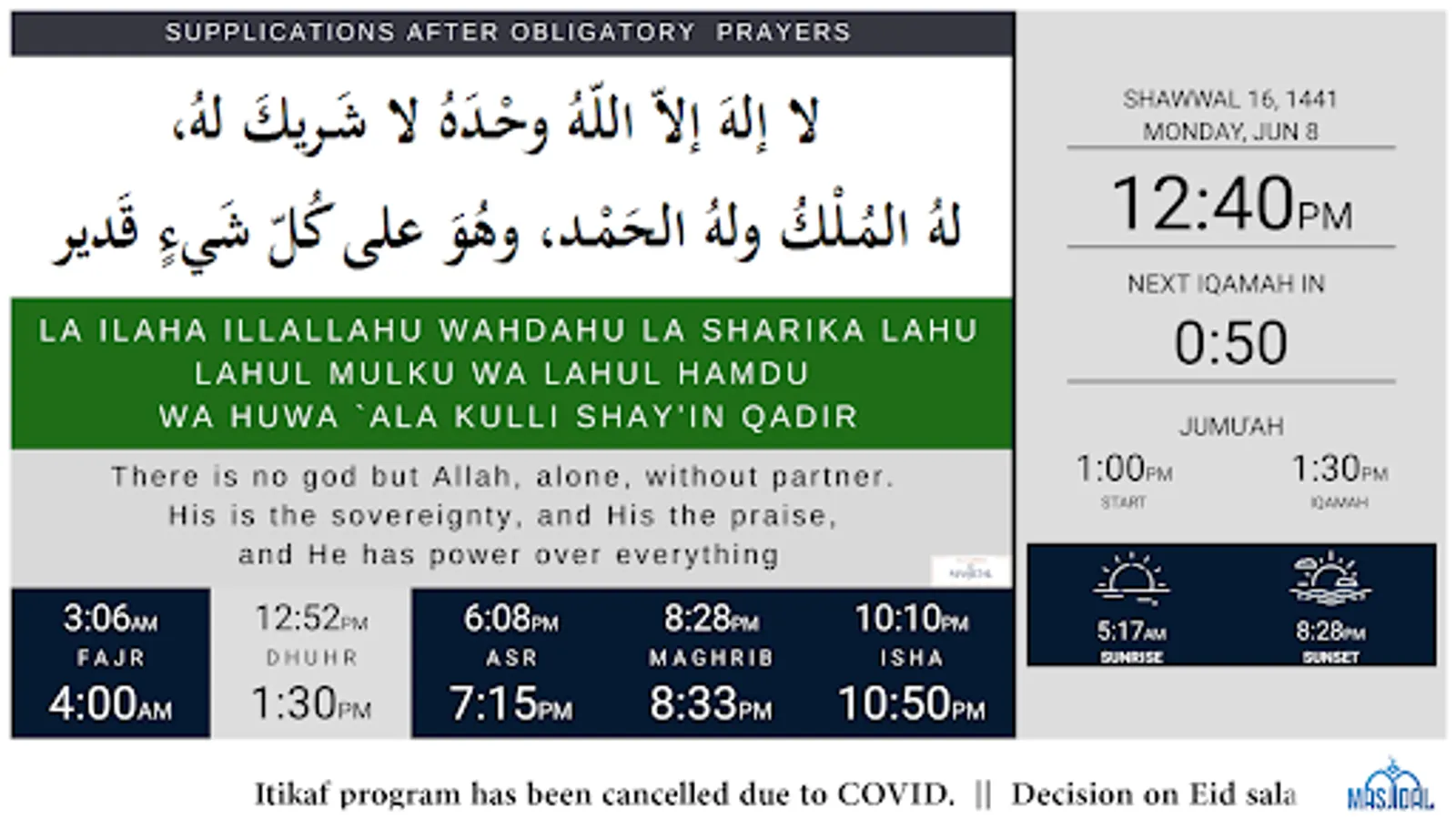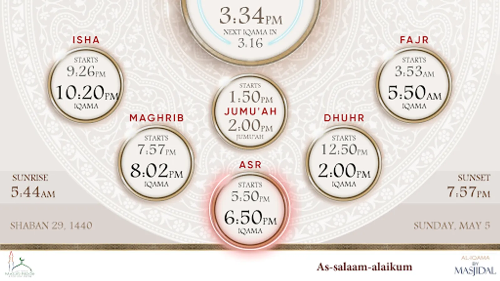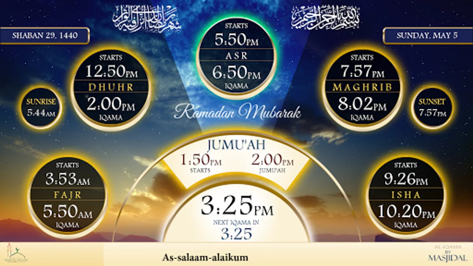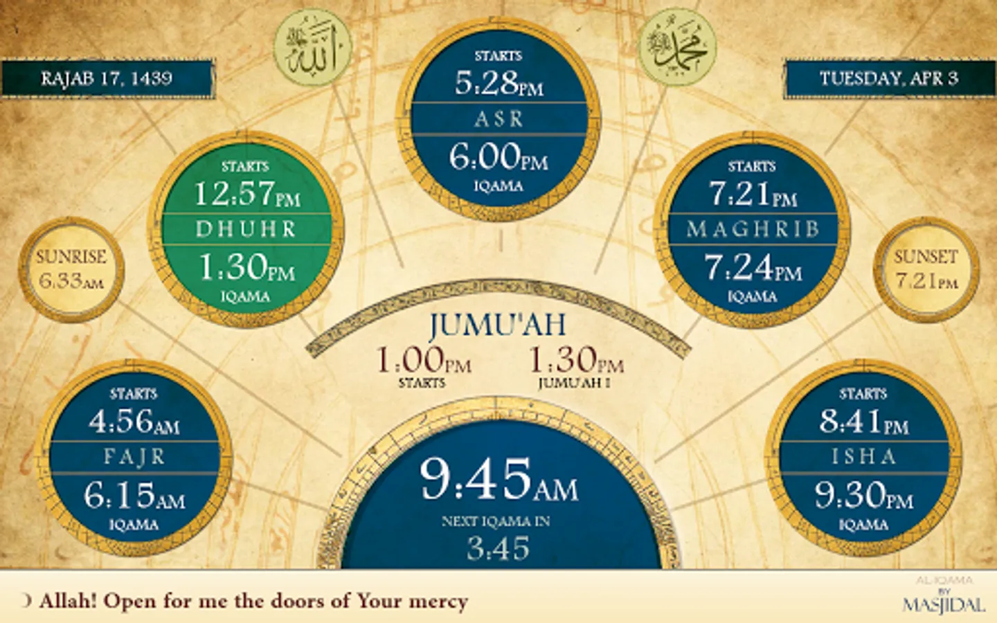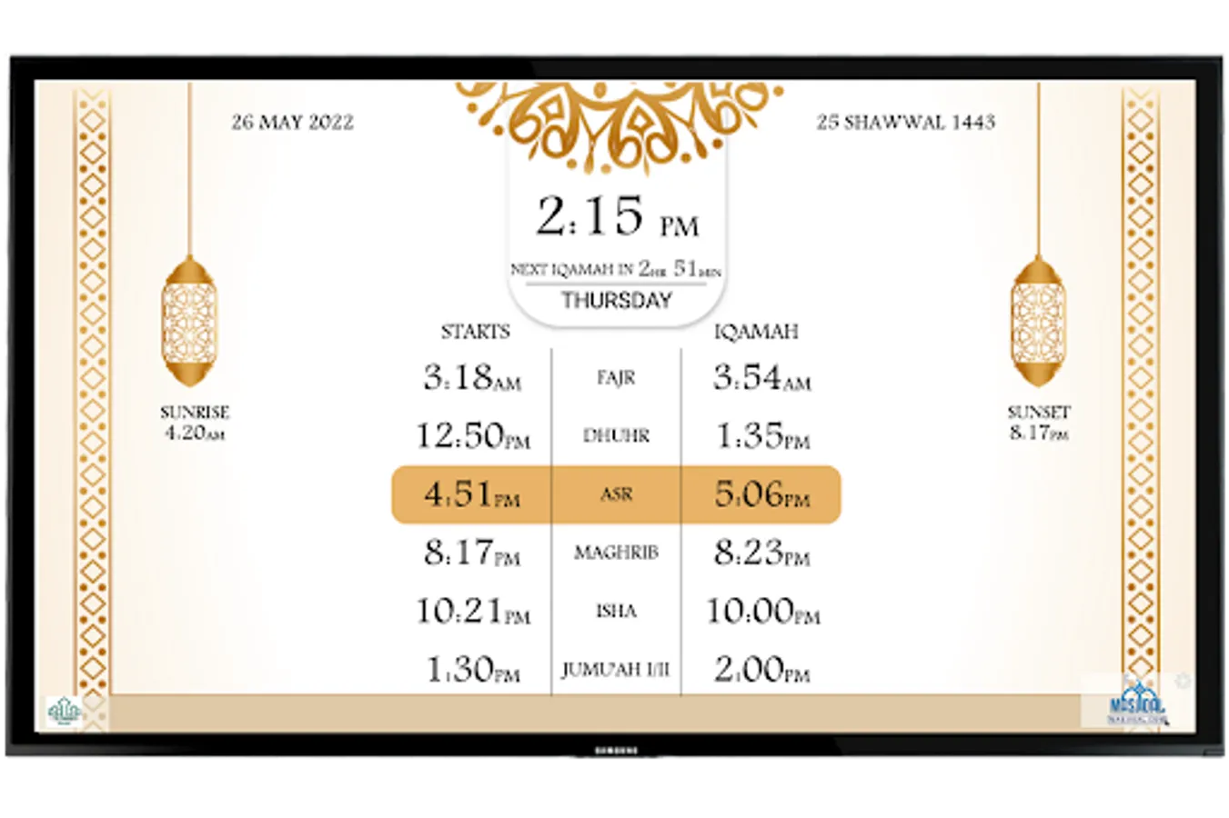 Exclusively developed for Masajids to display Iqamah times and more on big screens, Al-iqamah is an app like no other, it's the most advanced digital signage solution for Masajids. Ideal for displays inside the Masjid's. It's a digital Iqamah clock to replace the manual clocks and supports images, Google calendar/slides, web content, funeral announcements and much more. Packed with additional features such as beeping at Salah and Iqamah times, full screen reminder at the time of Iqamah for custom messages such as "Switch off your phones, make lines straight", announcement messages, auto messages for Iqamah time changes and multiple templates to choose from.