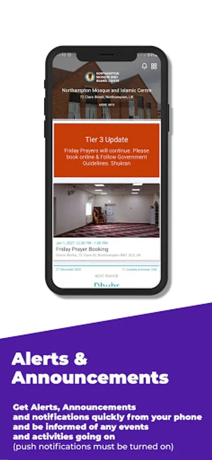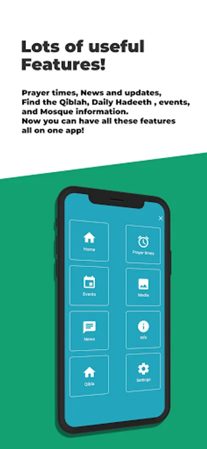 Prayer times, News and updates, Find the Qiblah, Daily Hadeeth , News, events, Push notifications and Mosque information.