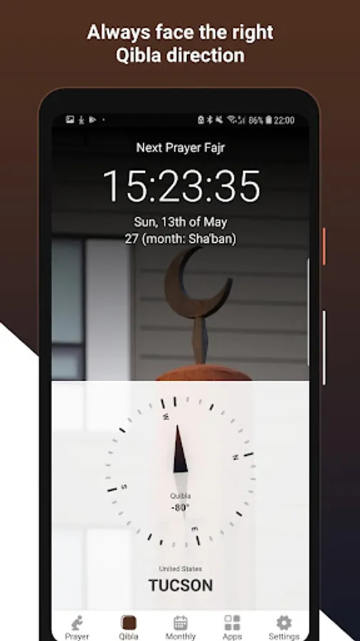 - Beautiful Azan sounds recorded especially for the app.