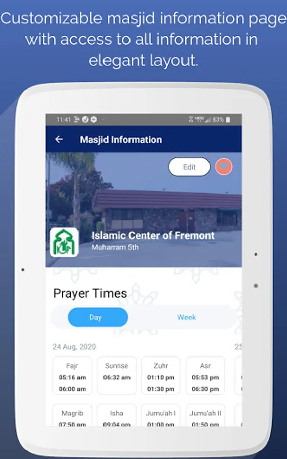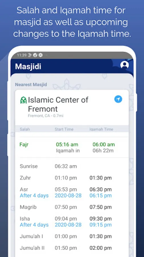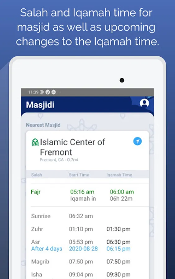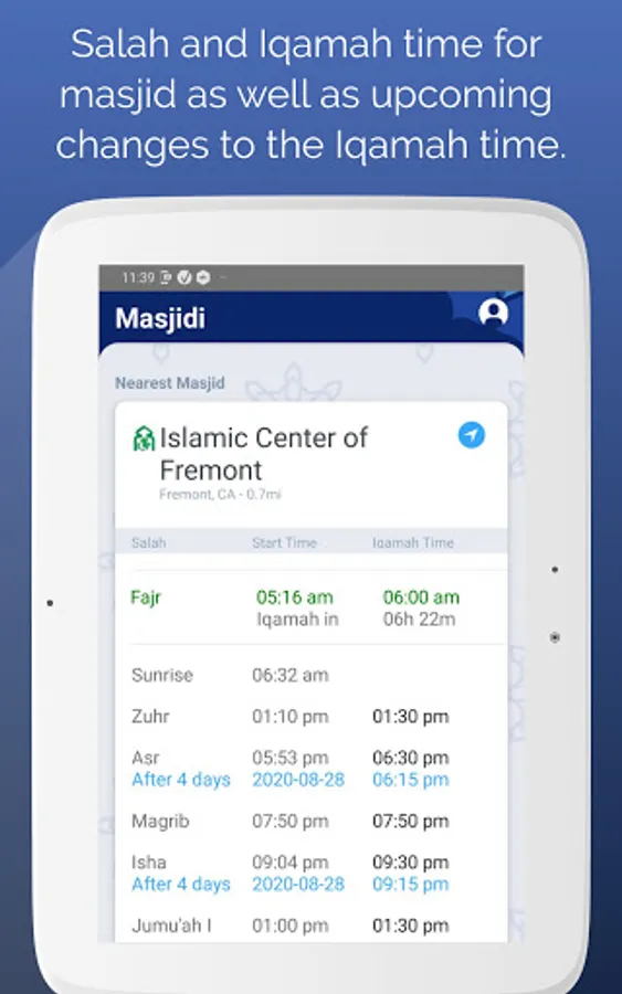 This application will provide the latest Salah times along with the Iqamah times for your local Masjid. Masjidi lists your Masjid's timings on your mobile device, giving you access to the latest Salah and Iqamah times.