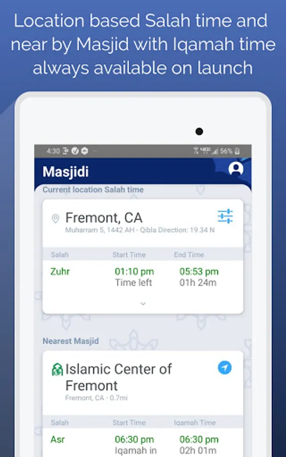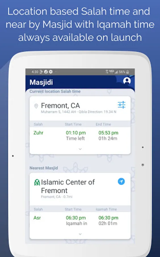 * Iqamah times are fetched from the Masjid's website, uploaded or managed by Masjid admins.