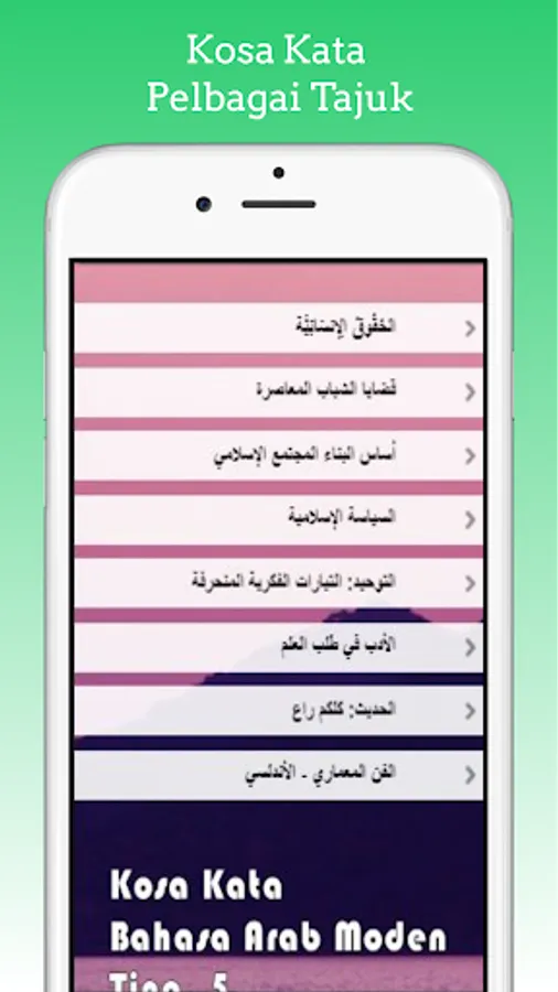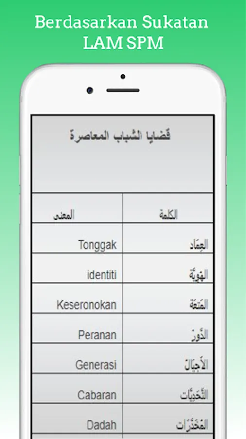 Aplikasi ini mengumpulkan kosa kata yang wajib dihafal oleh pelajar sekolah menengah khususnya subjek Bahasa Arab Moden.