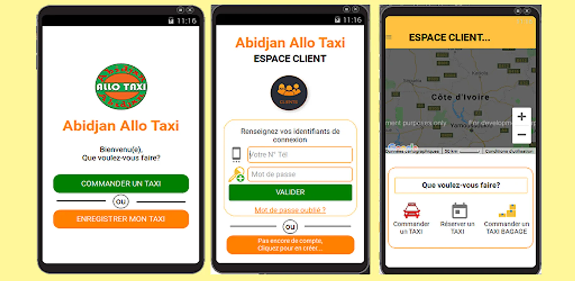 ABIDJAN ALLO TAXI (AAT) is an application for ordering and booking Taxi and vehicle transporting luggage and merchandise in Ivory Coast.