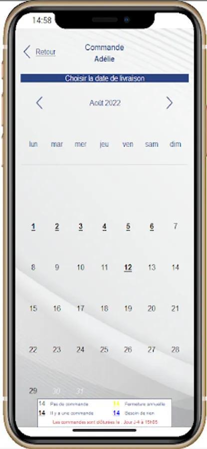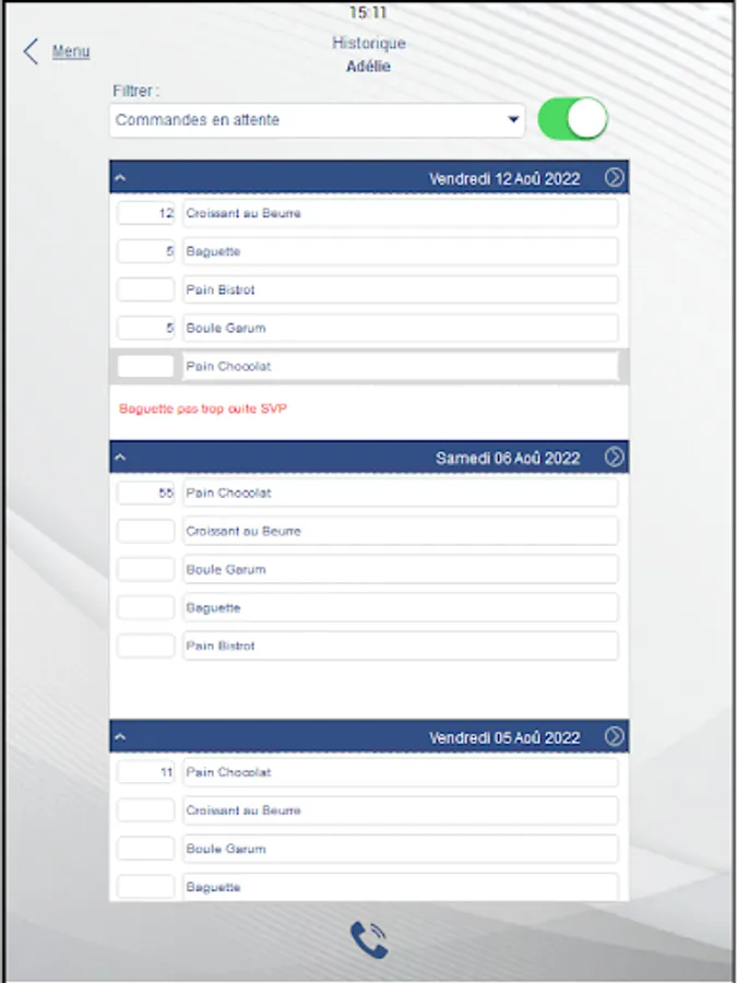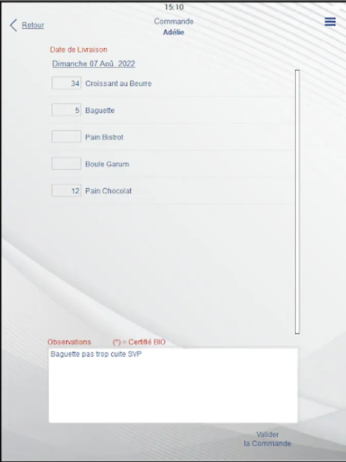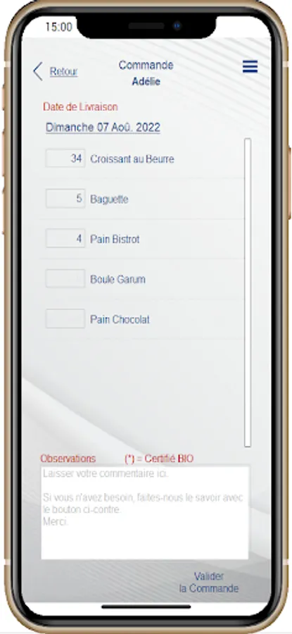 this application will allow you to place your daily order with your supplier (Bakery, Pastry, Market gardener ...)