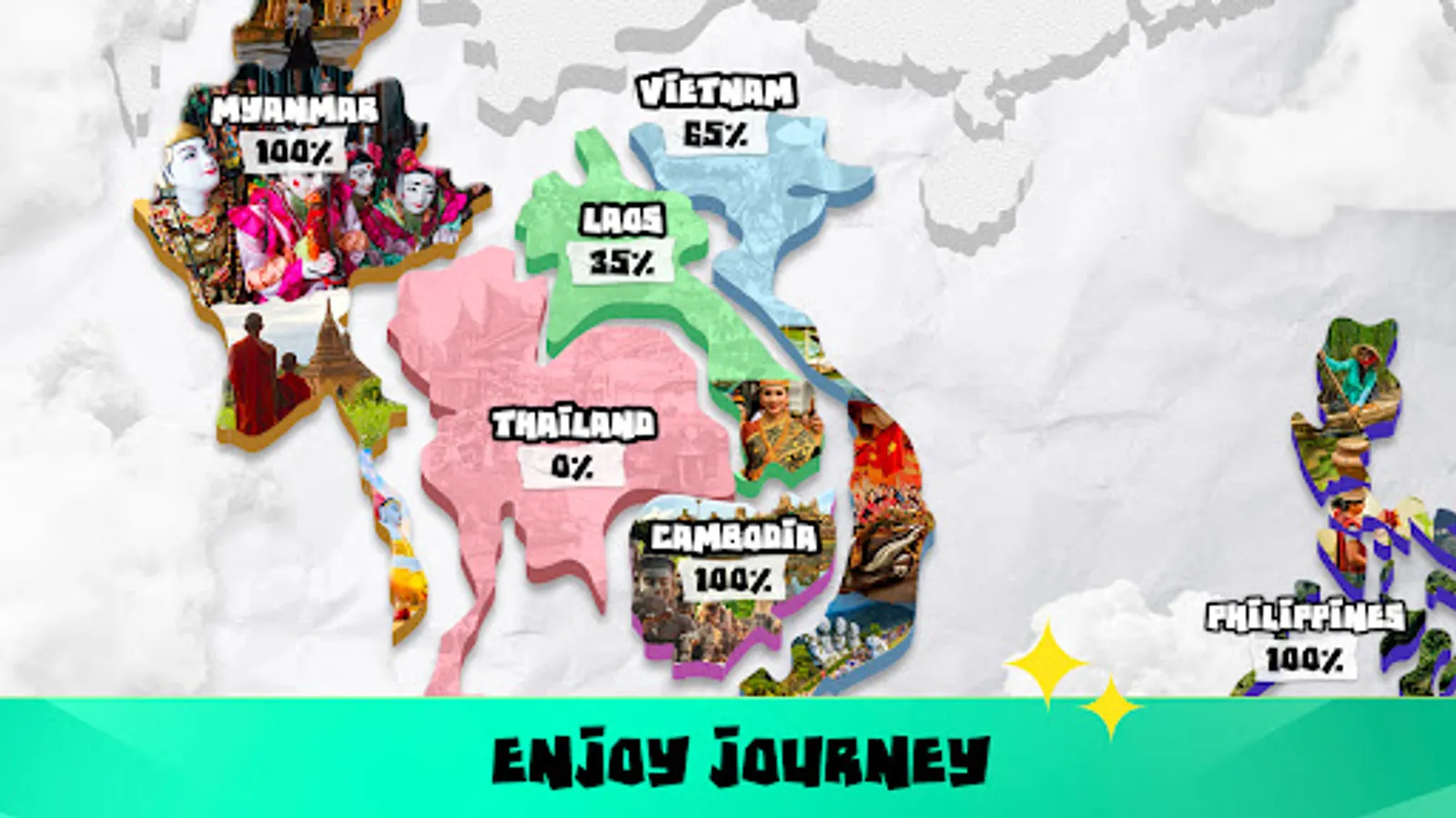 A cool feature of Find the Difference in ASEAN photo hunt game is that with each successful level completed, you’ll unlock the overlaying images of each country. Complete each country and enjoy the unique collages featuring each country’s culture and heritage. You can see your progress right out of the main menu of the game. Complete the entire ASEAN map levels to reveal the entire collage!