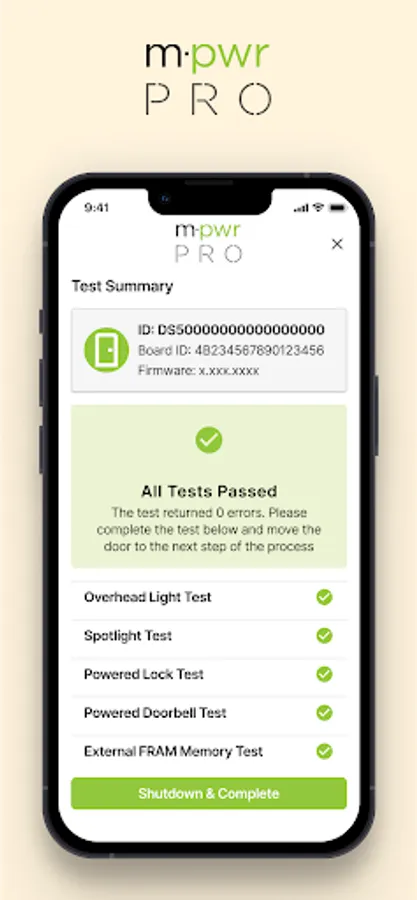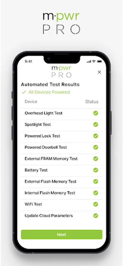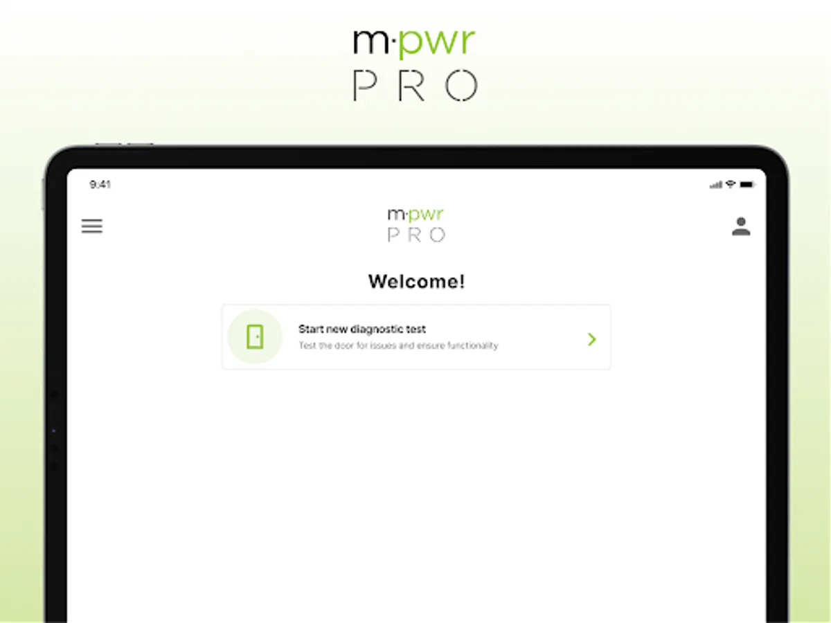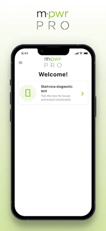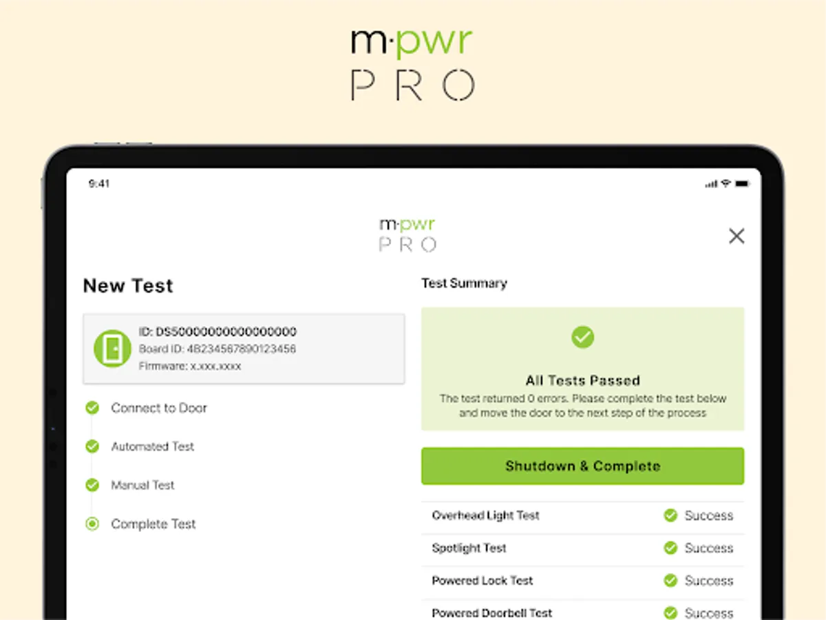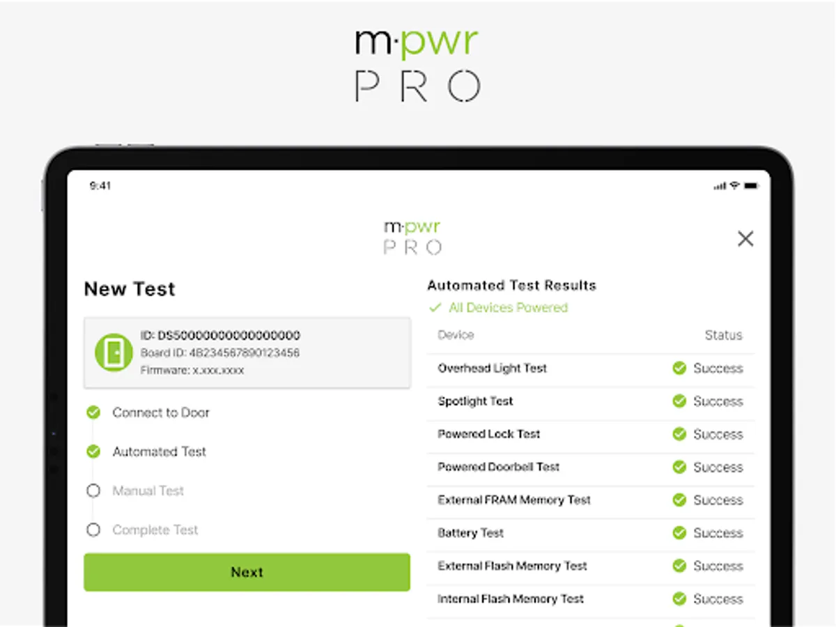 The Masonite PRO application allows users to run a diagnostics test against an M-Pwr door to validate smart components are working as intended.