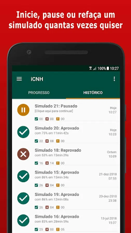 Looking for a practical and effective way to prepare for the Detran-BA theoretical driver's license (CNH) test (Valid for the entire state of Bahia)? We present our "Simulado CNH" application, the perfect tool to train and improve your knowledge in first aid, basic mechanics, traffic legislation, defensive driving, road signs, citizenship and the environment. Ideal for first license or renewal.