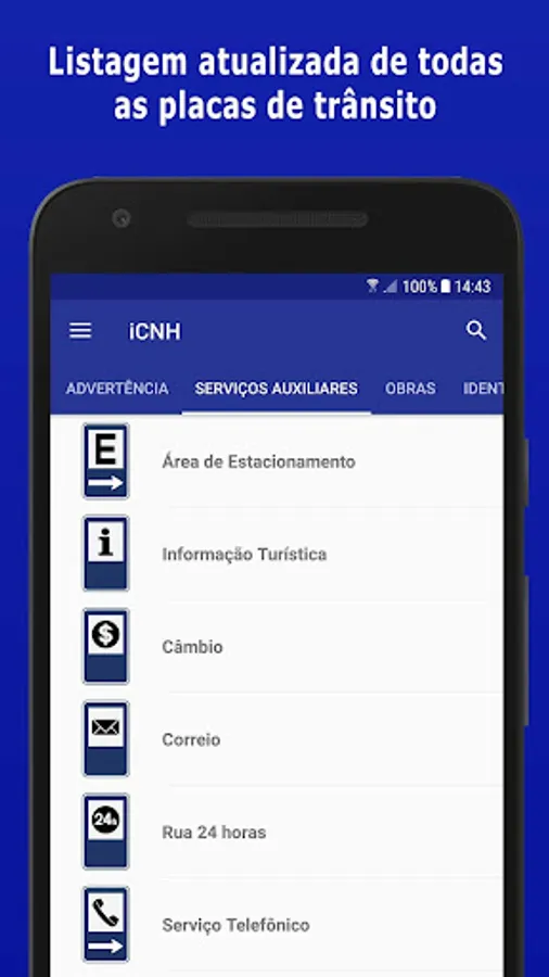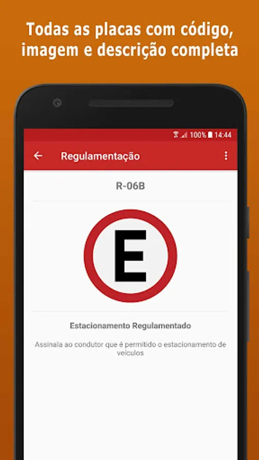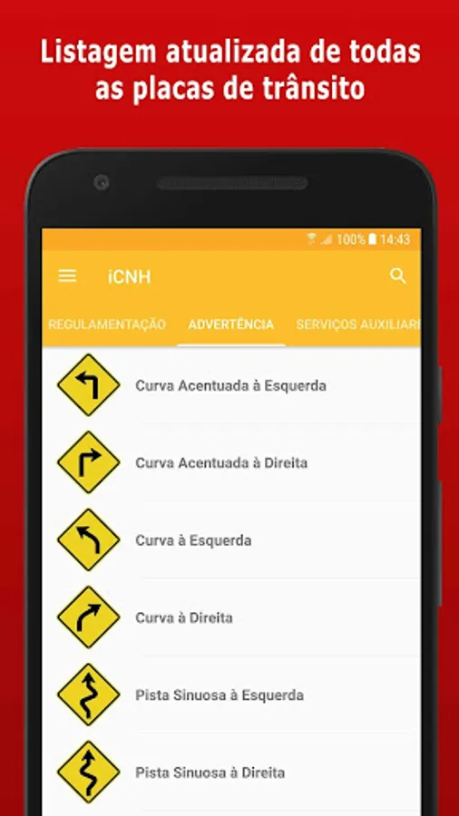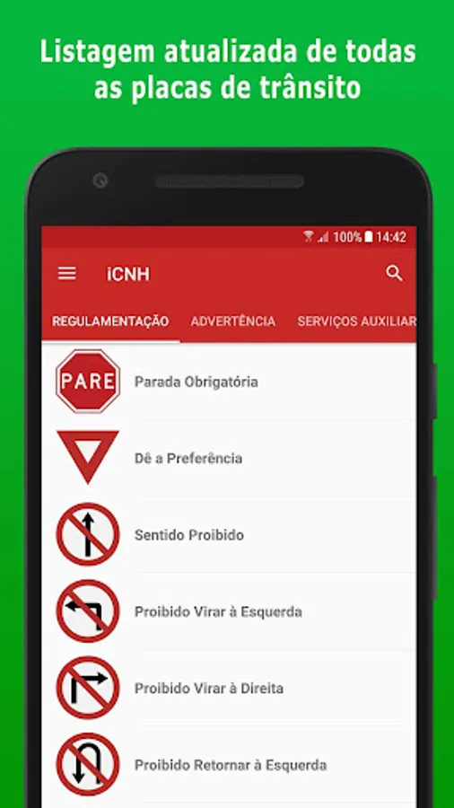 The application contains a list of the Main Traffic Signs that make up the study schedule for the Detran theoretical exam