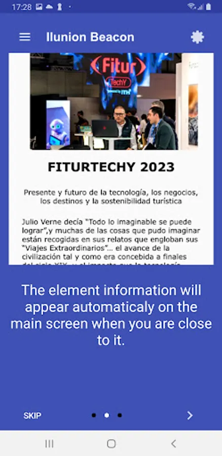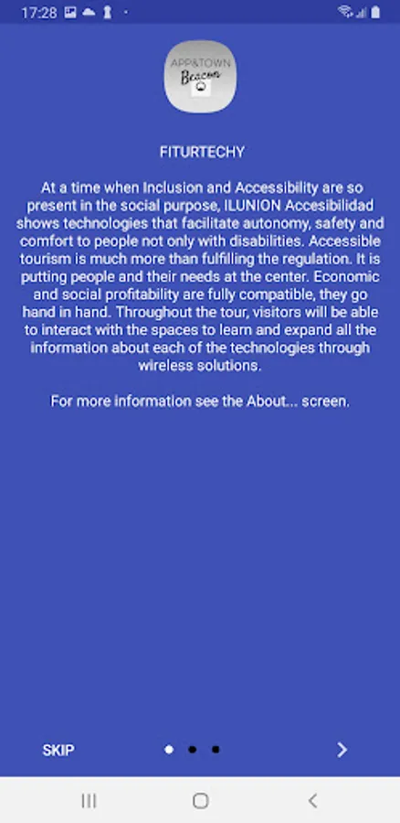 The ILUNION Beacon app uses App&Town Beacon technology, developed by Mass Factory, which allows the detection of nearby elements, through Bluetooth Low Energy Beacon technology. This allows all people to receive information about each item directly on their mobile. It can be used as an audio guide service, as well as an indoor guidance system, using this app.