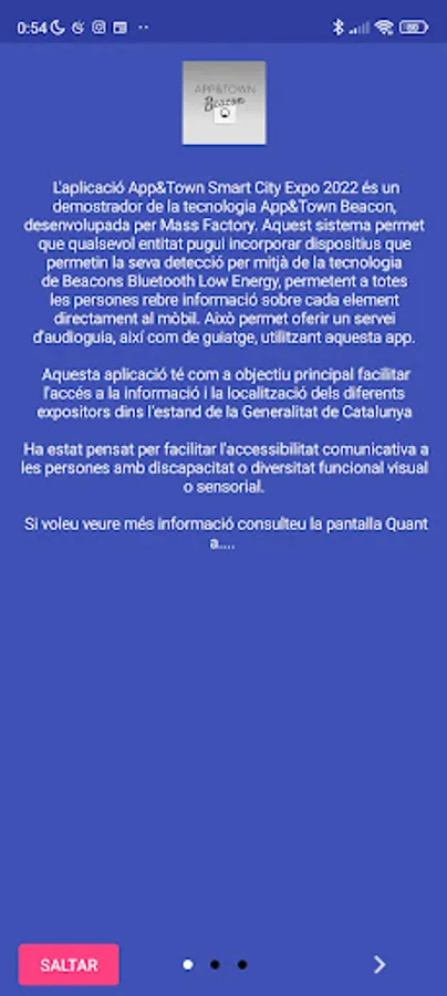 App&Town Smart City Expo 2022 app is a demonstrator of App&Town Beacon technology, developed by Mass Factory. This system allows any entity to incorporate devices that allow the detection through Bluetooth Low Energy Beacons technology, allowing all people to receive information about each item directly on their mobile. This allows to offer an audio guide service, as well as guidance, using this app.