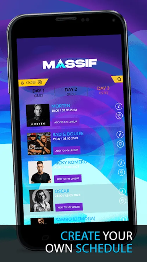 Create your own schedule and just enjoy the wilderness of MASSIF. We will take care that you won't miss your favorite artists, and we will send you a notification reminder before every show that you've selected.