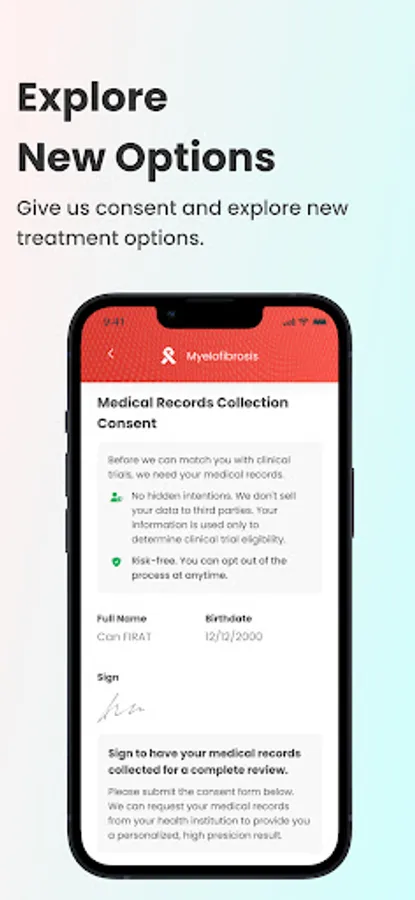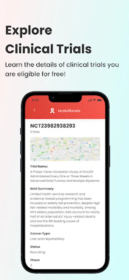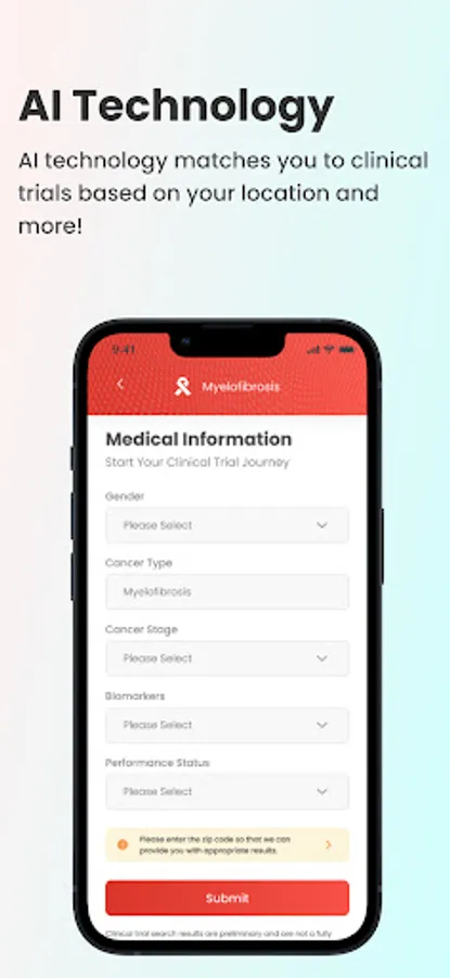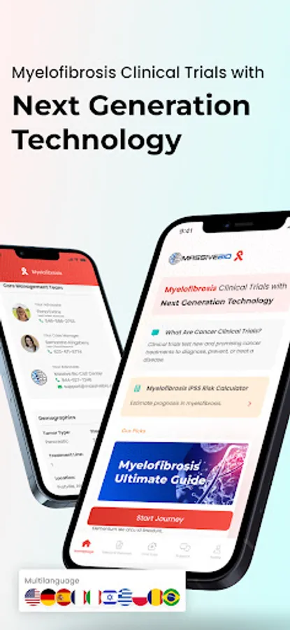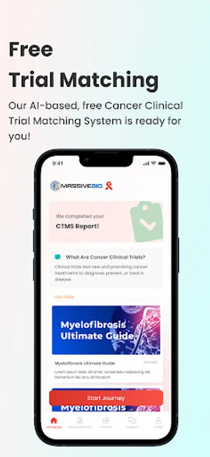 Our Artificial Intelligence (AI) based Clinical Trial Matching System, equipped with our multifaceted approach which incorporates services provided by our professional team of oncologists, oncology nurses, and patient advocates, matches your unique myelofibrosis characteristics to thousands of active clinical trials available in the United States. The app will notify you of any eligibility to enroll in a clinical trial near your home.