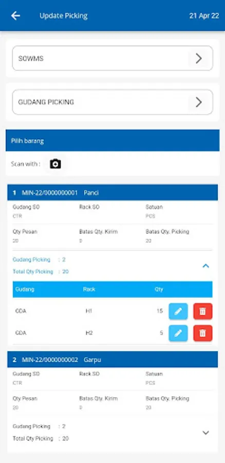 - Module to pick up goods using a barcode scan at the address (where the goods are stored) by the warehouse person when the Sales Order has been created.