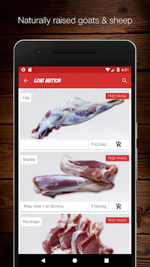Goat/sheep: Mutton, boneless mutton, keema, minced meat, liver, head, trotters, paya, shanks, rip chops, bheja, botee, bones