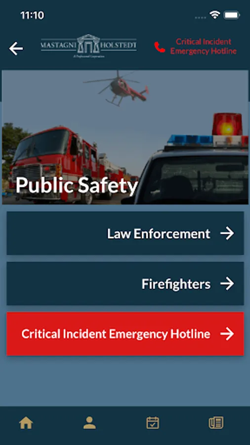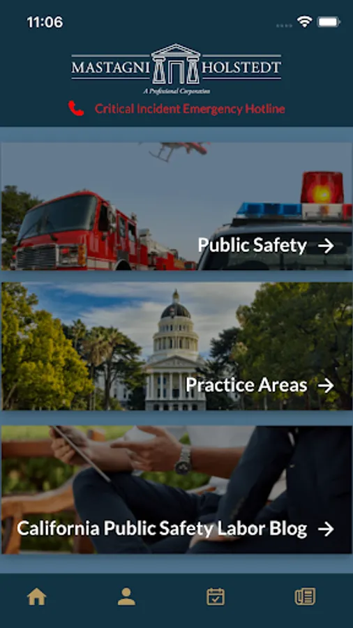 Whether you are a public safety professional, private or public sector employee, an individual injured in an accident, or you are looking to seek legal advice from a lawyer, this free law firm app can help you find a lawyer or learn more about Mastagni Law Firm on your phone or any mobile device.