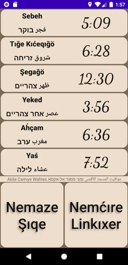 Also shows daily prayer times (Al-Aqsa mosque timing only).