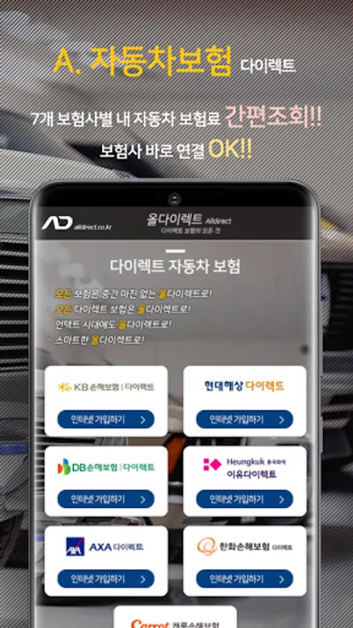 All Direct is an app that provides direct auto insurance, long term insurance and general insurance. You can use it simply without registering as a member. If you have any inquiries, please use a review or email.