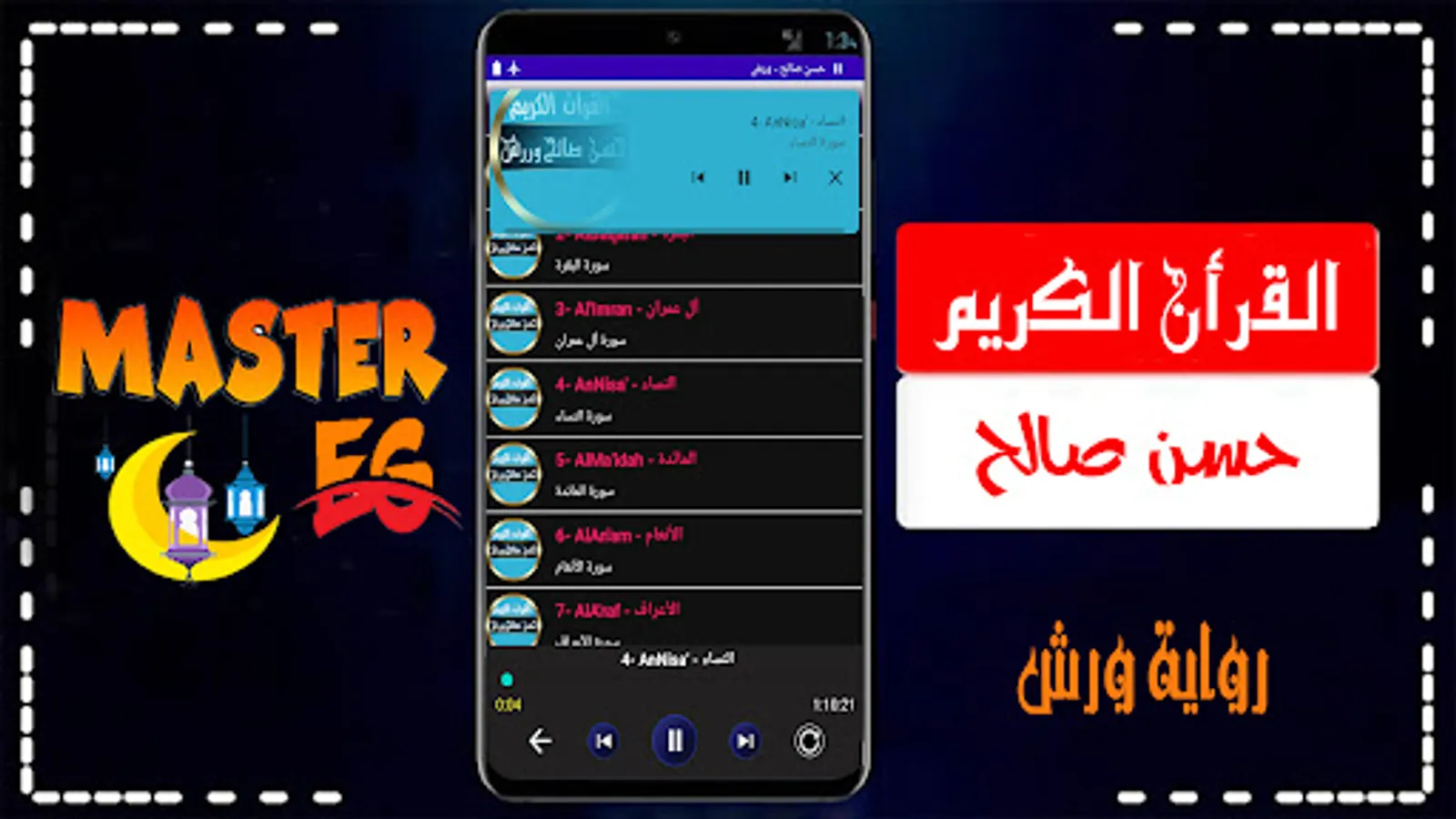 If you, dear listener, are a fan of listening to the surahs of the Qur’an, then downloading the Qur’an of Sheikh Hassan Saleh Warsh without the net is the perfect choice for you, and you can listen for free to all the surahs. There are features within the application, including supplications of the prophets and messengers, prophetic supplications, and many religious supplications, including supplications for istikhara, need, and qunoot.