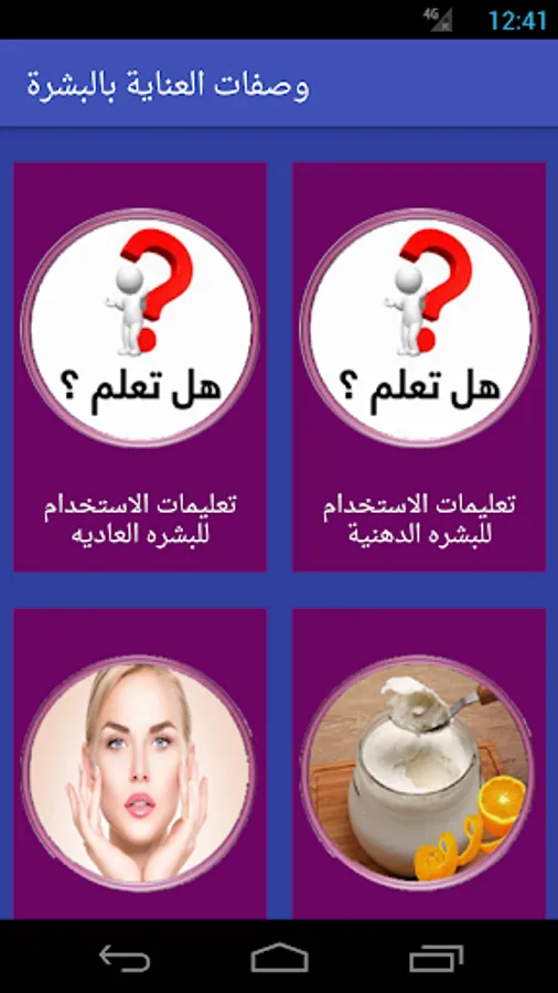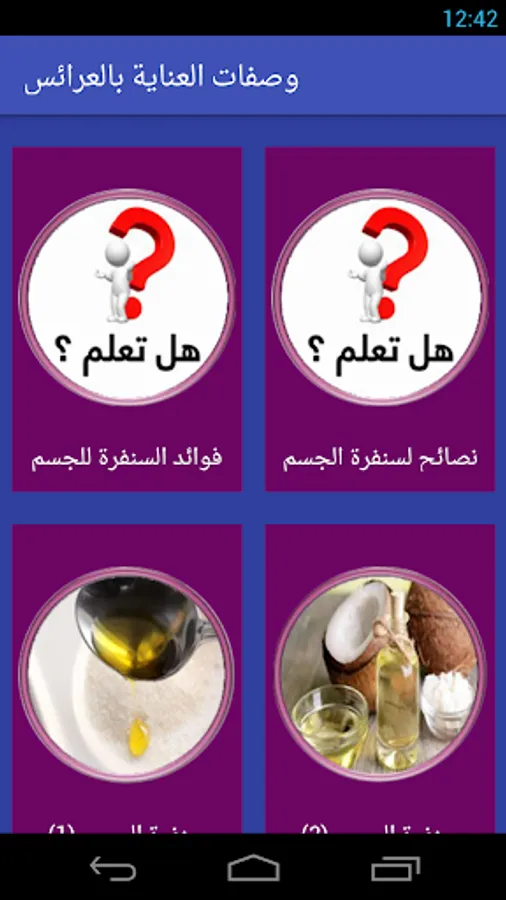 The application contains recipes for masks, natural mixtures, easy to prepare, with effective natural ingredients for the face, body, hair, and mixtures for removing makeup, as well as special recipes for every bride-to-be. Through the recipes that contain ingredients that contain vitamins and essentials that the skin needs and maintain its softness and freshness of the skin from dryness and give the skin a soft texture through exfoliating recipes that are important for the skin, there is a description of the benefit of each recipe in the application, and the application also contains instructions for use (for oily skin and dry skin) and more