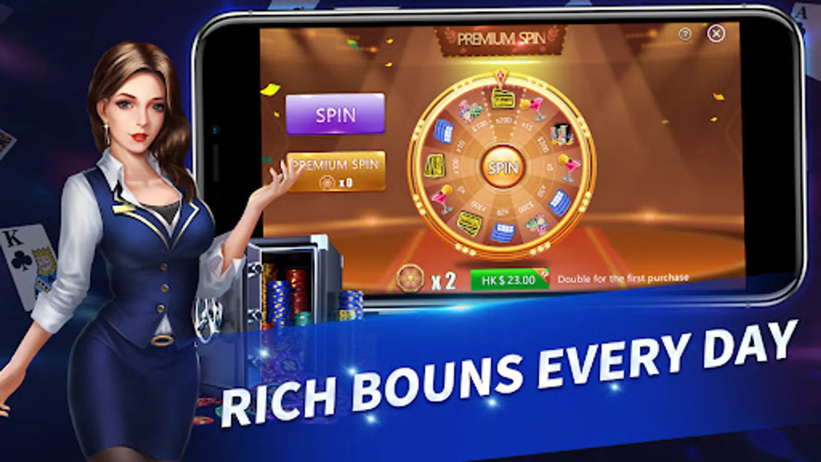 Get a generous welcome gift of free chips every day and collect free bonuses. Complete various quests and achievements for more poker chip rewards! Don't forget to spin and win big!