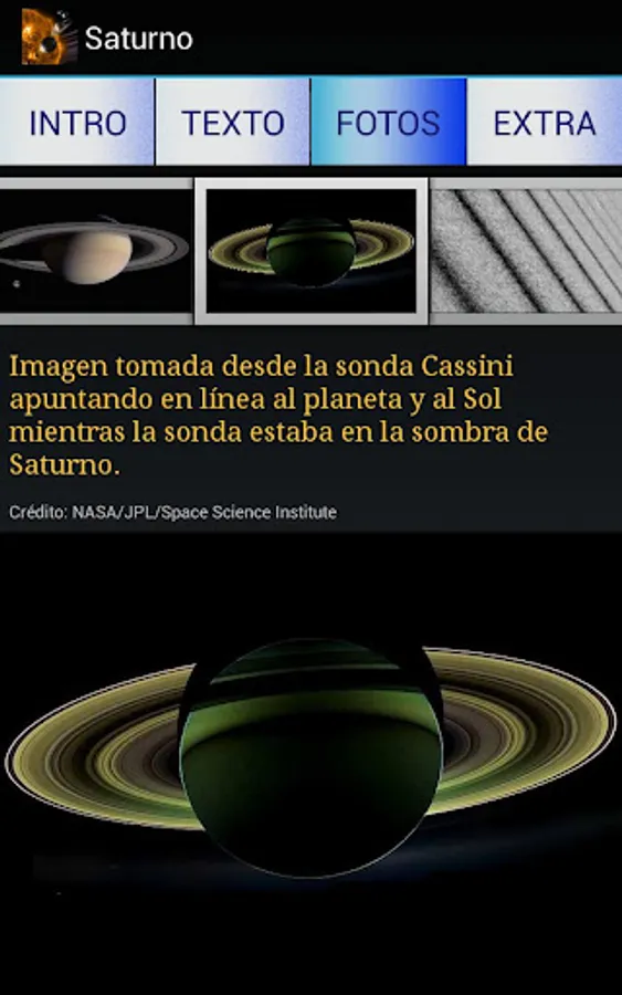Planets: where you will get detailed information about each of them besides the moon. You get an introduction, text with images, photo gallery and for several of them an extra section its most striking feature.