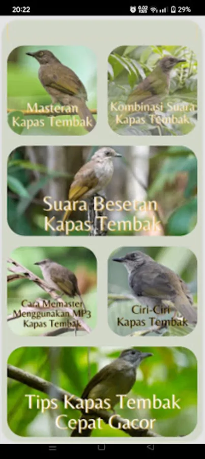 In the Masteran application, Download the latest Champion Cotton Shoot Sounds, which are easily summarized for you to listen to every day. The Cotton Shoots Bird Chirping Audio for Full Masteran Long Duration Stuffing which will always be the latest and updated. As a complement, download the sound of cotton shoots of long duration. Don't miss it to get a compilation of the sound of cotton shoots, fighting gacor, ngerol, filling champions and long, suitable for training chirping birds with mp3 audio which will always be updated for all of you, of course you will never lose to download the sound of cotton shoots full of stuffing for masteran champion 1 accompanied by audio therapy after this sound jam!! What are you waiting for, download it right now.