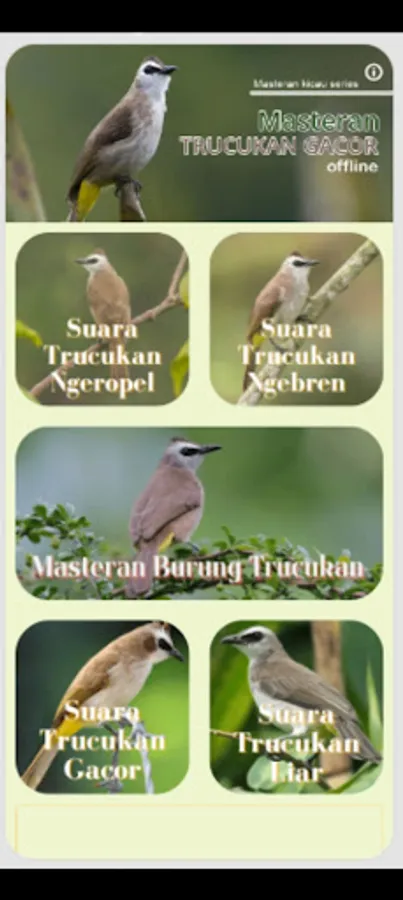 One of the newest applications of Masteran Trucukan Ropel Gacor Complete Champion we can get through your respective Android cellphones easily, Download Masteran Trucuk Mp3 Chirping Sounds which are specially tuned for masters where this application is made to make it easier for all of us to listen and of course comes as a reference Download Sound MP3 Trucukan Masteran for Masteran Long Duration Mp3. Sometimes we have trouble getting a complete MP3 full Gacor Trucukan Sound? Having trouble getting the most complete download of the sound of the Gacor, ngeBren Meeting and Ngunci male birds at this time? Here, we present a collection of long duration trucukan ngerol sound downloads for masters, guaranteed all the latest entries, which are an important reference for all of you. Through the application download the sound of the male trucukan bird, champion and long, suitable for training chirping birds with mp3 audio, we can get the sound of the full duration trucukan bird, besides that it can also be easily played via your respective Android device.
