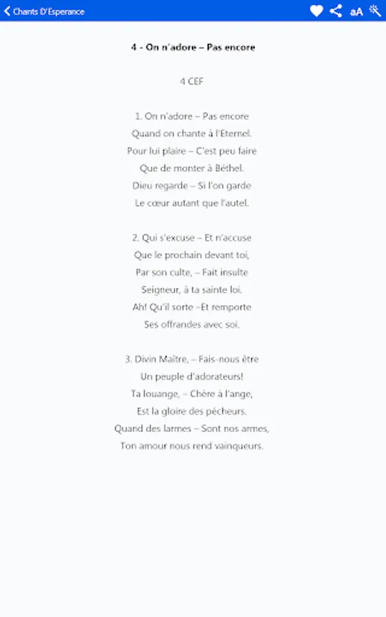 Chants D'Esperance avec mélodies vous permet d'accéder à toutes les paroles du livre de chanson chants d'esperance. Certain airs sont également inclus avec les paroles afin que vous puissiez apprendre et aider à votre adoration.