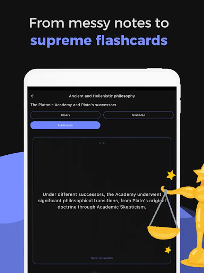 Mind maps to visualize concepts, flashcards for easy memorization, quizzes to test yourself - choose how you want to explore the world of philosophy.