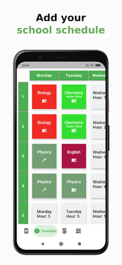 Enter your school timetable and customise it to your liking. Plan your studies with School Planner - Diary, Timetable, Grades, Tasks.