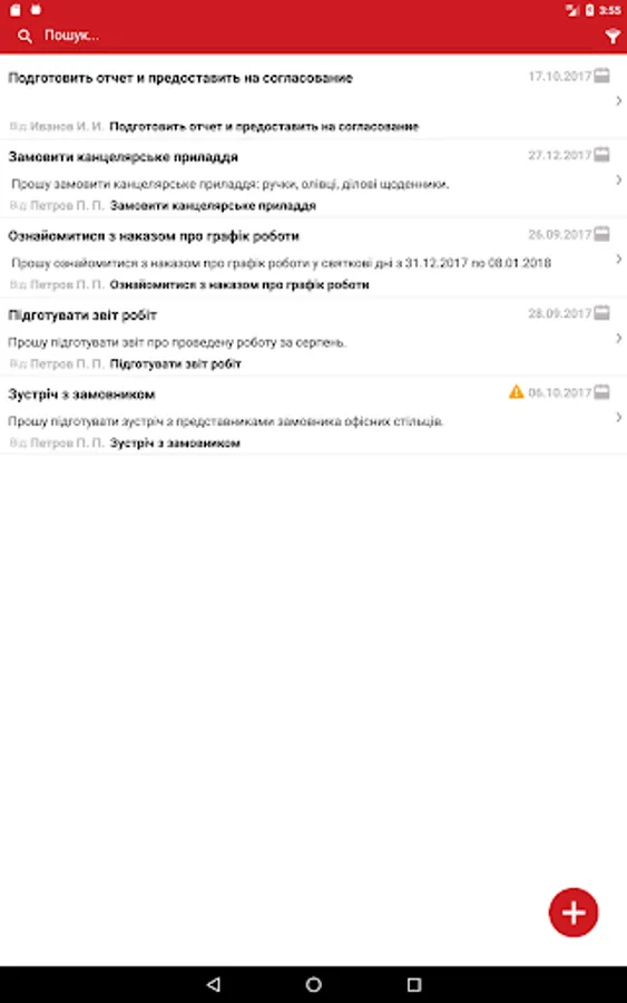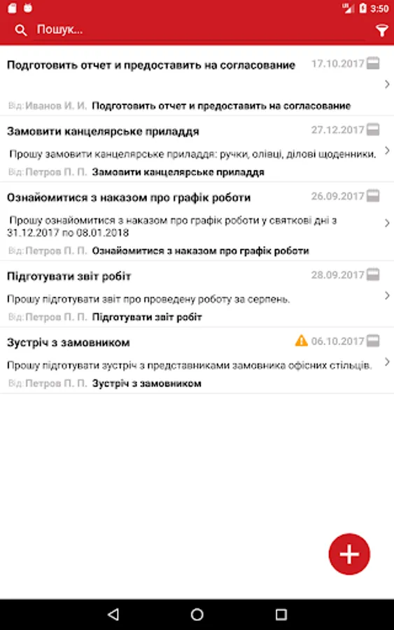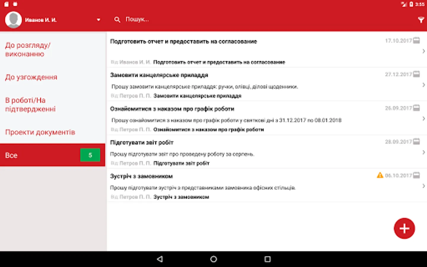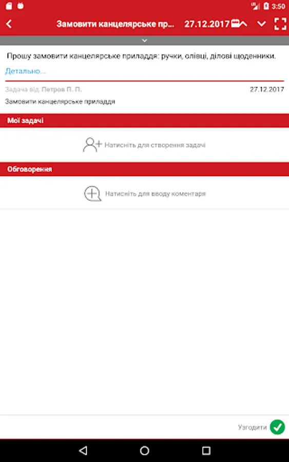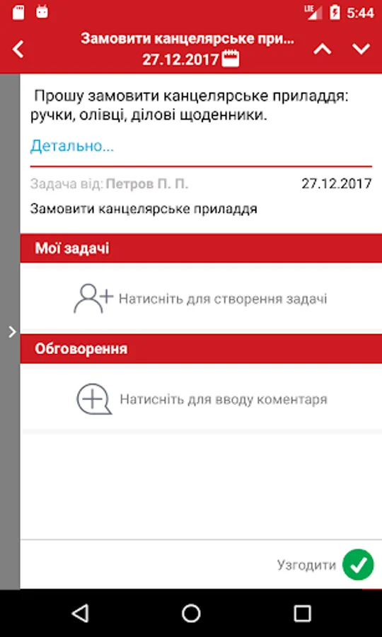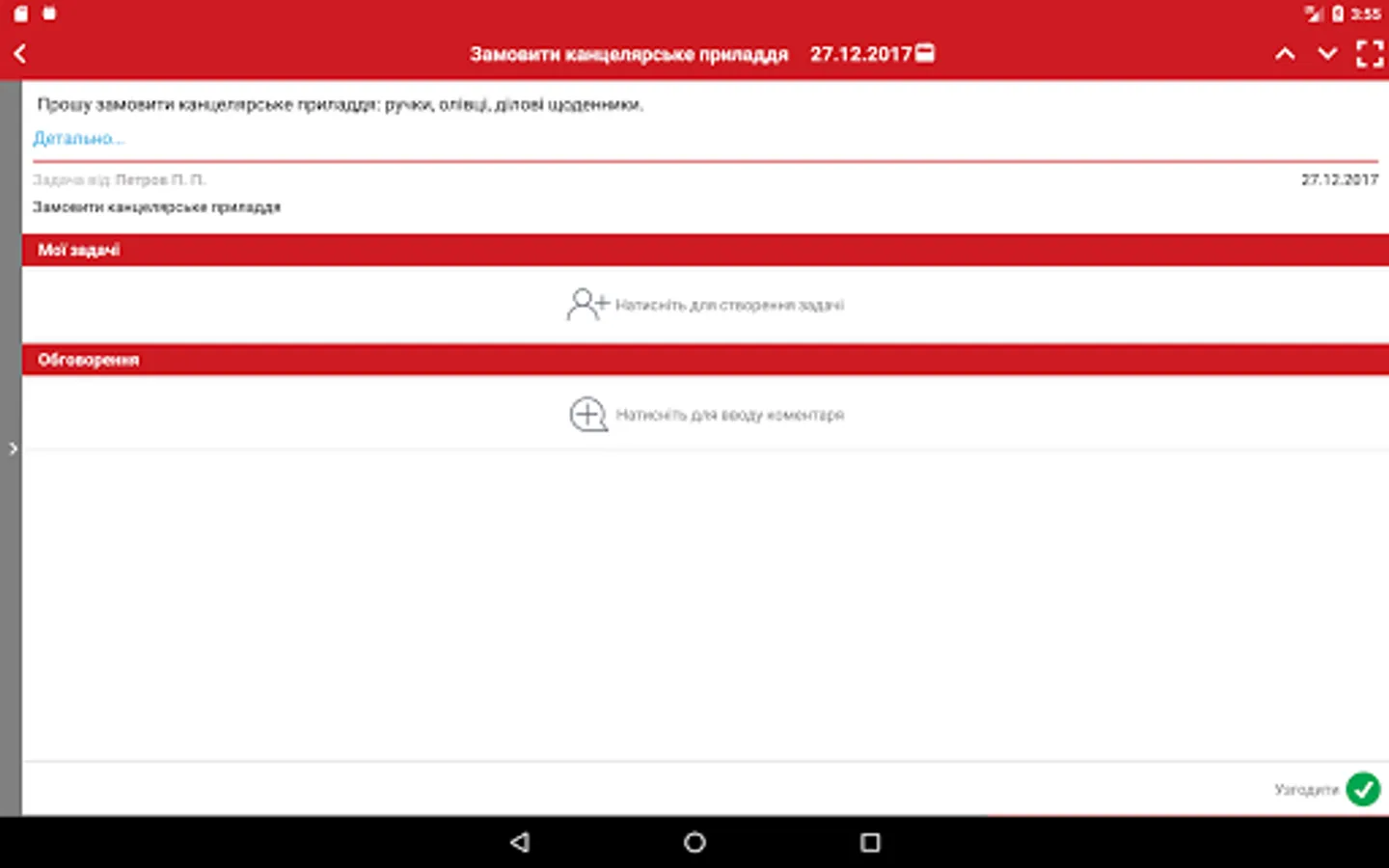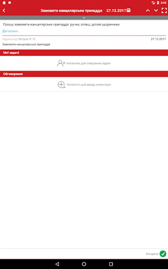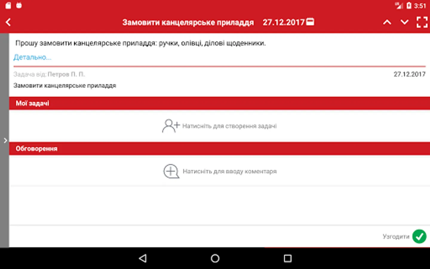 The application allows you to work on tasks together, discuss, delegate tasks, to clarify the position before the agreement. Directly in the application can add, delete, view attachments (scans documents, spreadsheets with calculations, any text, photo, etc.).