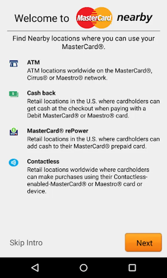 The MasterCard Nearby mobile app helps you quickly and easily find places where you can use or get access to your funds using your MasterCard® or Maestro® debit, credit or prepaid card or mobile wallet.