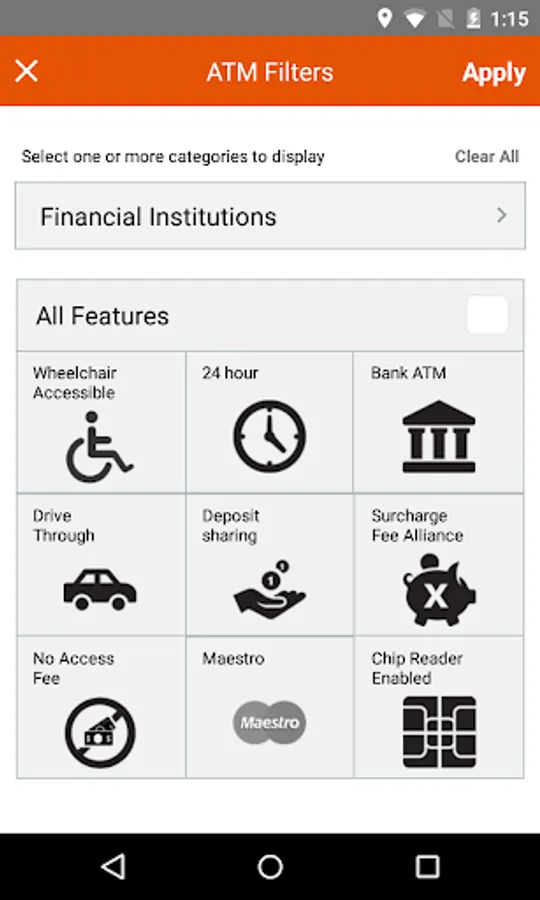 -Filter by bank name or ATM features; such as drive through, 24 hour, Maestro and EMV acceptance, fees and more